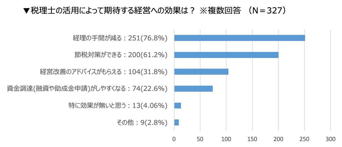 最後に、回答者全員に対して、税理士を活用することで、経営にどのような効果があるかについて聞いたところ、最も多かった回答は、「経理の手間が減る」(76.8%)、次に「節税対策ができる」(61.2%)、「経営改善のアドバイスがもらえる」(31.8%)という結果になりました。