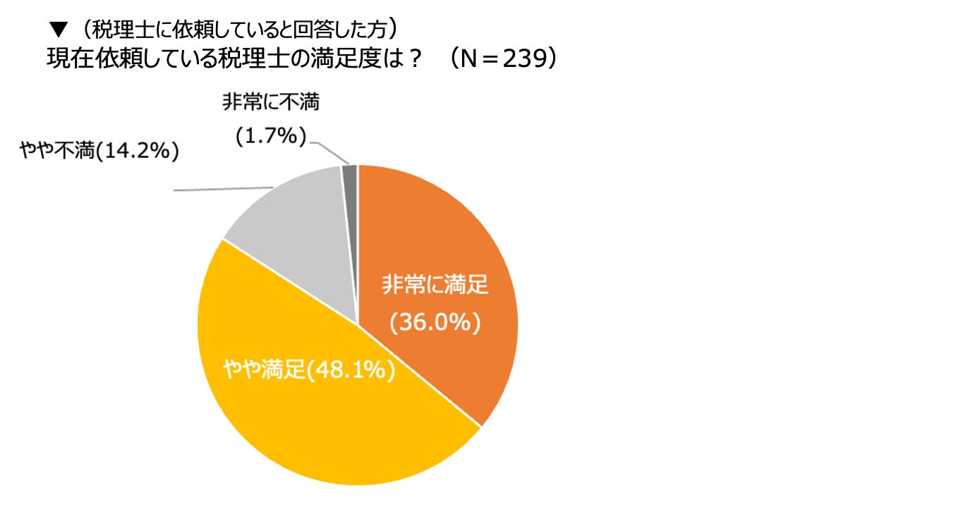 そして、現在依頼している税理士の満足度を聞いたところ、「非常に満足」(36.0%)、「やや満足」(48.1%)と84.1%が満足していることがわかります。