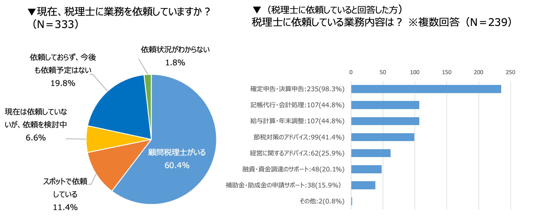 まず、税理士への業務の依頼状況について聞いたところ、「顧問税理士がいる」(60.4%)、「スポットで依頼している」(11.4%)と回答。71.8%が何らかの形で業務を依頼していることがわかりました。