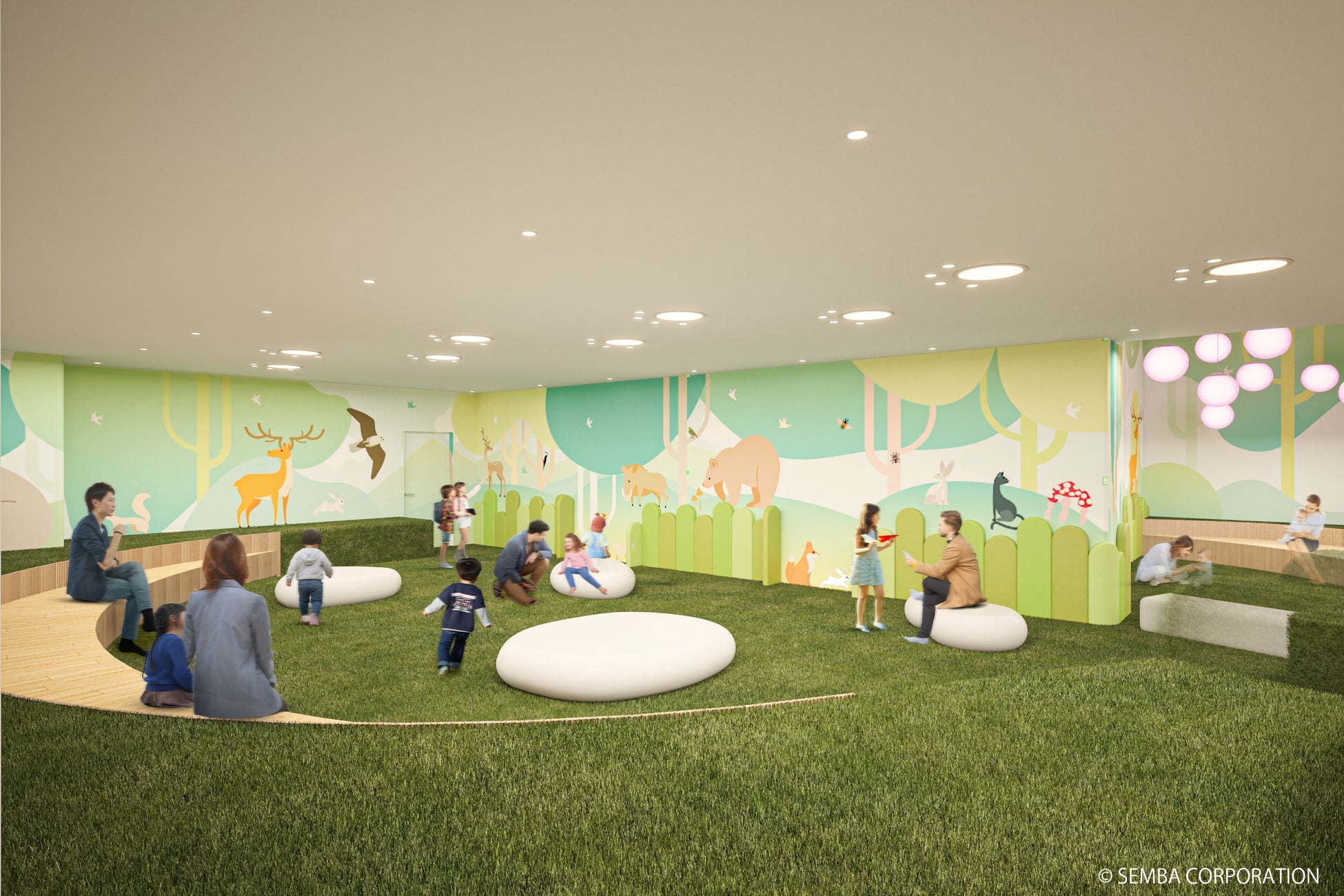 ■壁面には海老名市から望める「丹沢大山」で暮らす動物たちのイラストをあしらい、子どもたちが地域について知る・多様性を学ぶ機会を提供します。