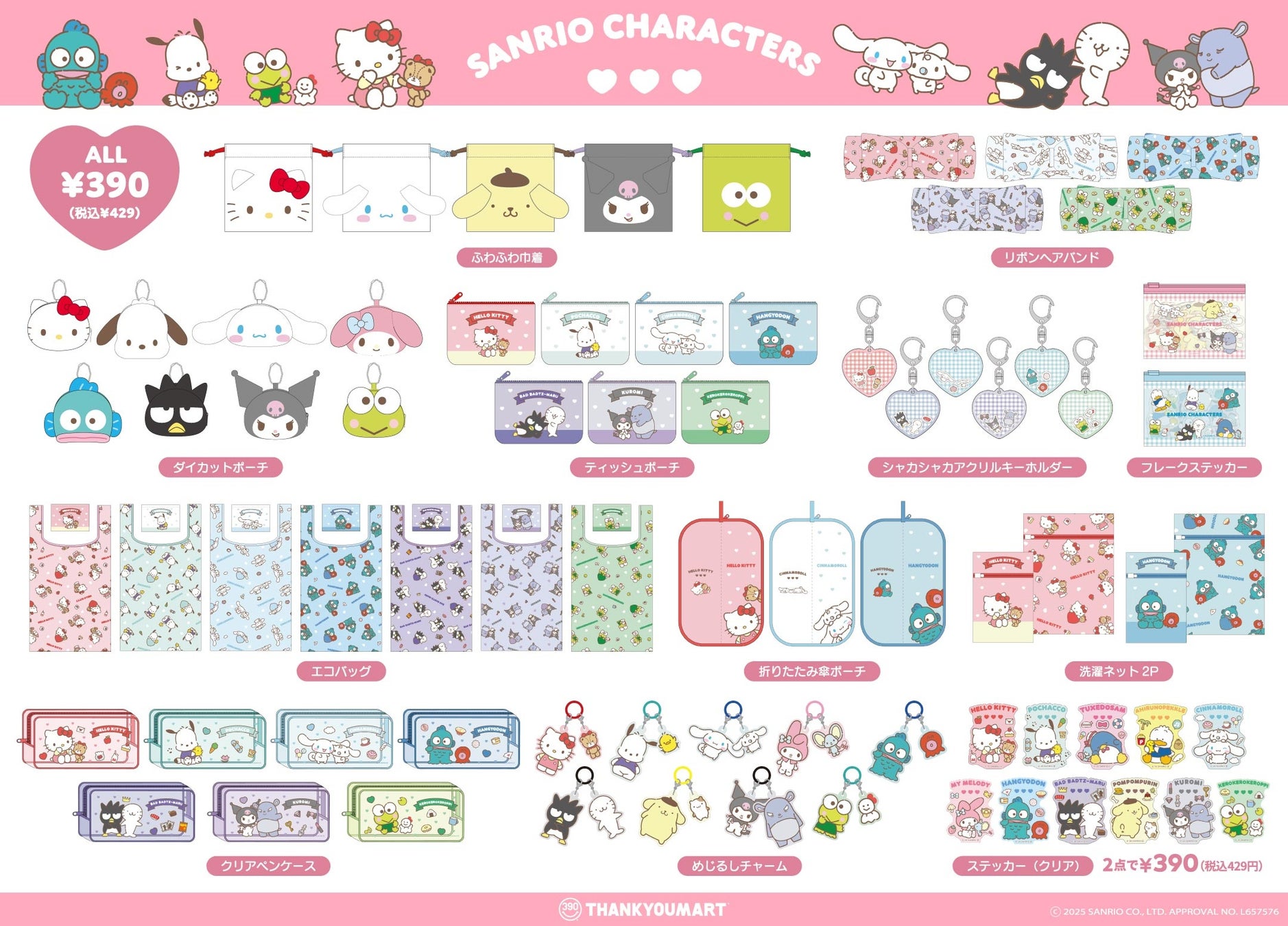 「Be Smile, Be Kawaii」をテーマに、キャラクターの限定アイテムを中心としたカワイイ推しグッズがいつ来てもALL390円で手に入るショップ「サンキューマート」は、株式会社サンリオの「ハローキティ」や「シナモロール」など大人気7キャラクターとそのお友だちをフィーチャーしたコラボレーション雑貨を、全国のサンキューマート店舗で5月下旬より入荷次第販売開始いたします。