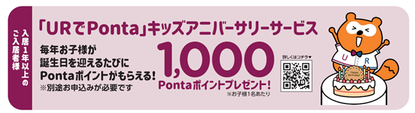「URでPonta」に登録している方を対象に、お子様が誕生日を迎えるたびにPontaポイントをプレゼントするサービスです。詳細はお申込みサイトをご覧ください。(お申込みサイト :https://ponta-ur.jp/kids/)
