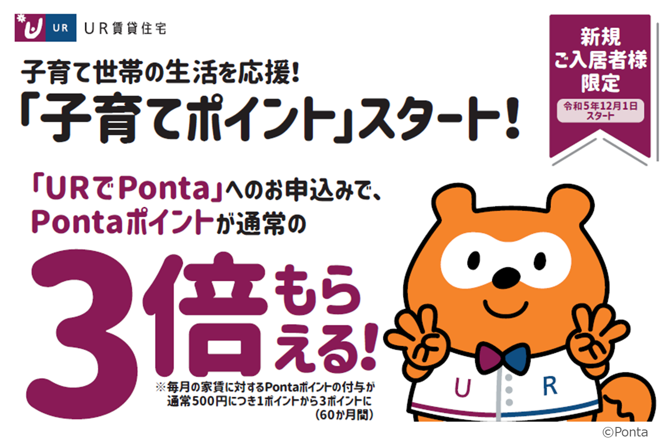 ポイント加算 | 支払家賃500円ごとに2Pontaポイント (子育てポイントに加えて、通常の「URでPonta」による支払家賃500円ごとに1Pontaポイントが加算されることで、合計3Pontaポイント加算となります) |