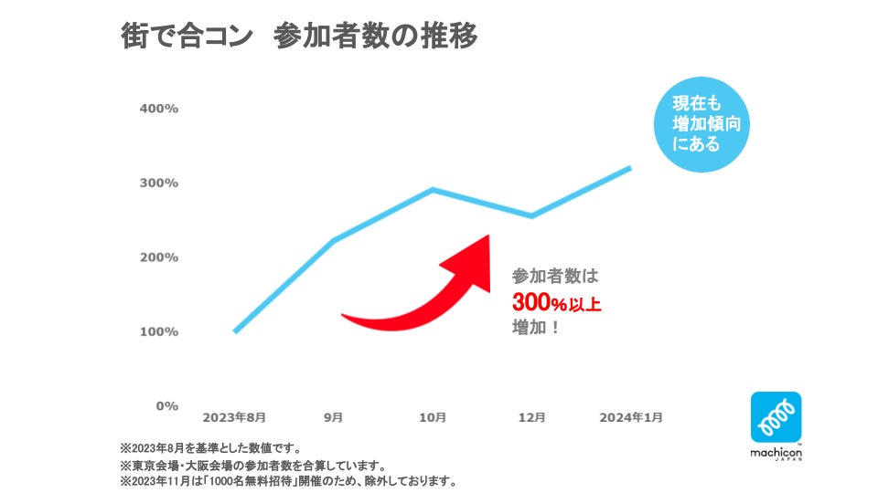 「machicon JAPAN」では、グループでリアルに会ってグルメを通じた出会いを楽しめるイベント『街で合コン』を2023年8月から定期開催してきました。コロナ禍以降、大規模な街コンの開催を行っていなかった状況の中で、2023年8月~2024年1月の参加者数は300%以上増加し、その後も着実に増加傾向※にあります。