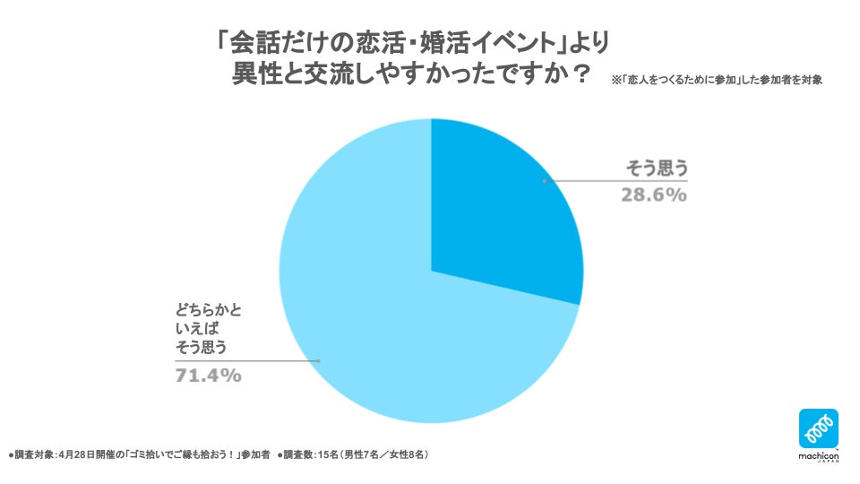 「ゴミ拾いでご縁も拾おう!」に「恋人をつくるために参加」した参加者を対象とし、「会話だけの恋活・婚活イベントより異性と交流しやすかったか」を伺ったところ、全員が「そう思う(28.6%)」「どちらかといえばそう思う(71.4%)」と、ゴミ拾いを通した恋活・婚活イベントの方が交流しやすいという結果となりました。