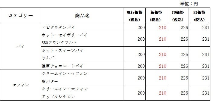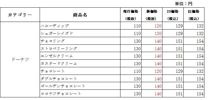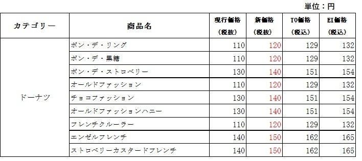 この度の価格改定は、ドーナツ、パイ、マフィンが対象商品です。