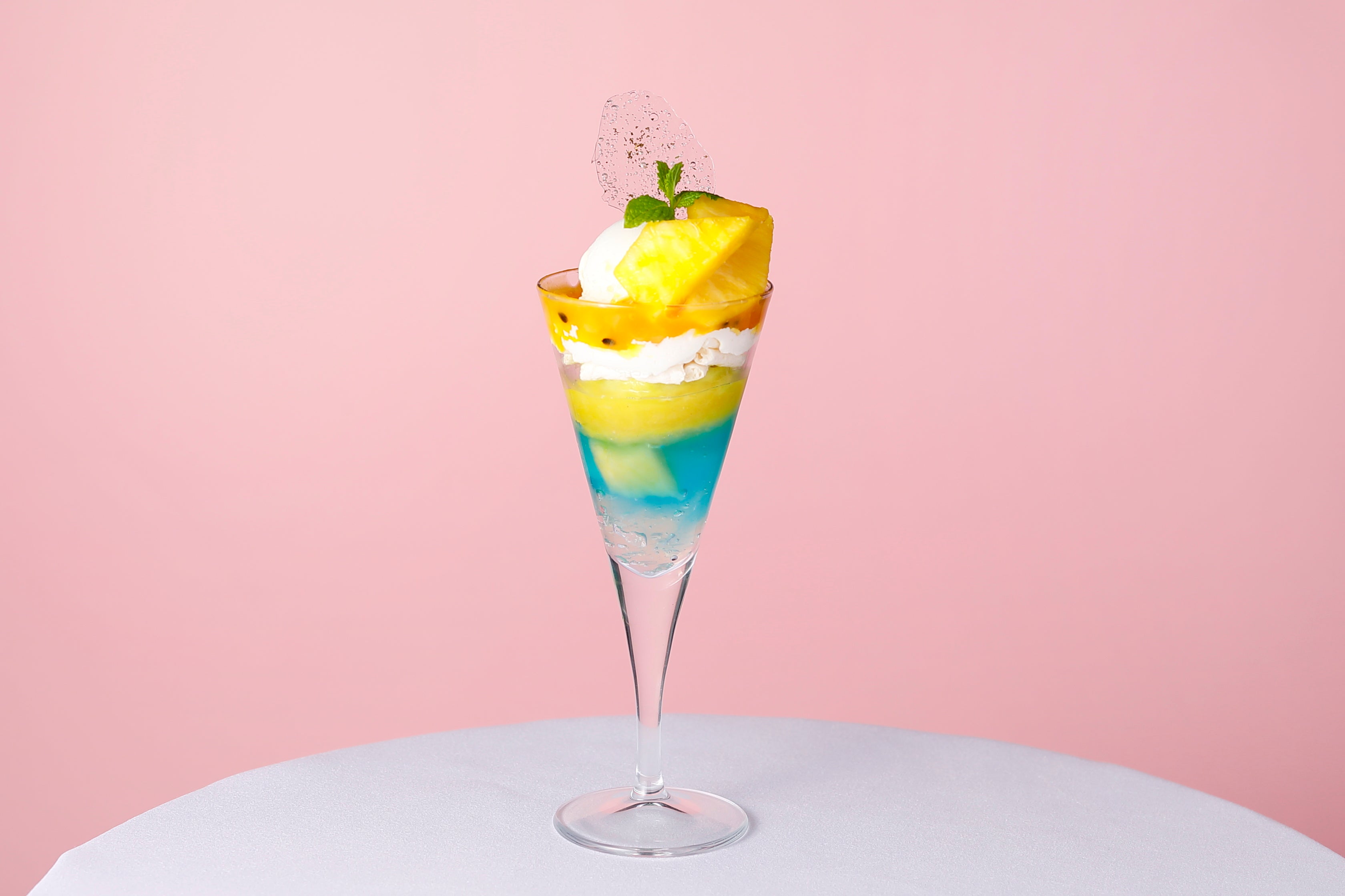 さわやかな味わいの“ゴールデンパイン”とココナッツをパフェに仕立てました。パッションフルーツのソース、バ ジルのソルベ、青りんごのゼリーとともに涼やかな夏のパフェをお楽しみください。