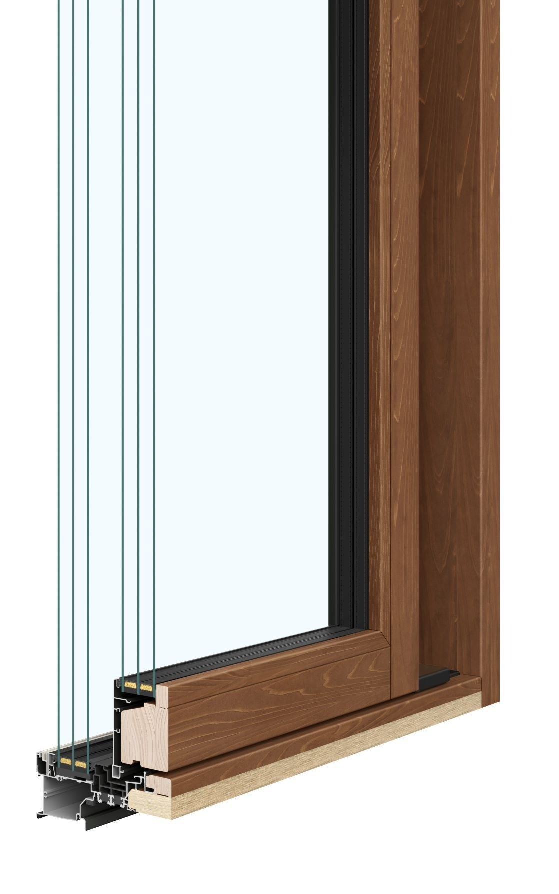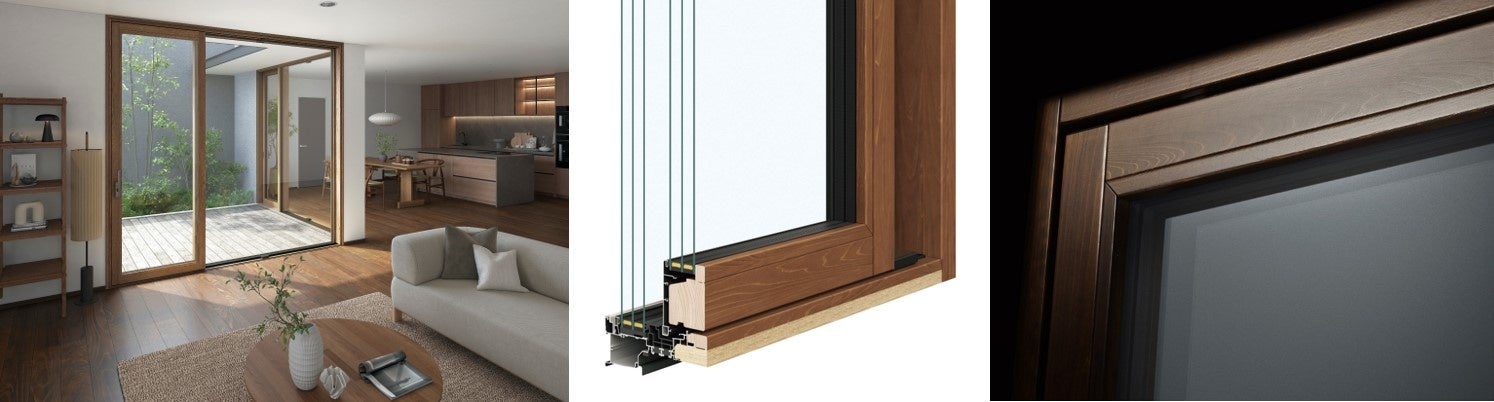 国産桧の集成材を使用した上質感のある意匠性と、トリプルガラス仕様による高い断熱性能を兼ね備えた木製窓です。耐風圧性S-5 等級・水密性W-5 等級を有し、戸建木造住宅だけでなく集合住宅などの非木造建築物にも対応可能。室内側は国産桧の集成材、室外側はアルミで被覆したアルミクラッド構造とすることで、雨や日射による木材の腐朽や色褪せを防ぎ、メンテナンス性にも配慮しています。