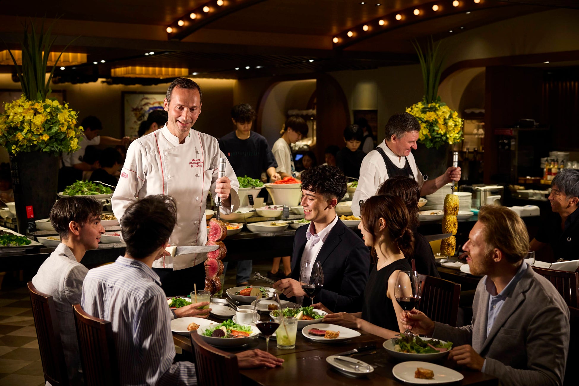 シュラスコとは、ブラジリアンバーベキューのことです。塊のまま串に刺し岩塩のみで焼き上げたジューシーなお肉を、「パサドール」と呼ばれる肉専門スタッフがそのままの状態でテーブルまでお持ちし、お客様の目の前でお好きな部分をお好きなだけ切り分けてご提供するスタイルのバーベキューです。岩塩のみのシンプルな味付けで、油を一切使わずに焼き上げる為、肉の余分な脂も落ちてとてもヘルシーです。