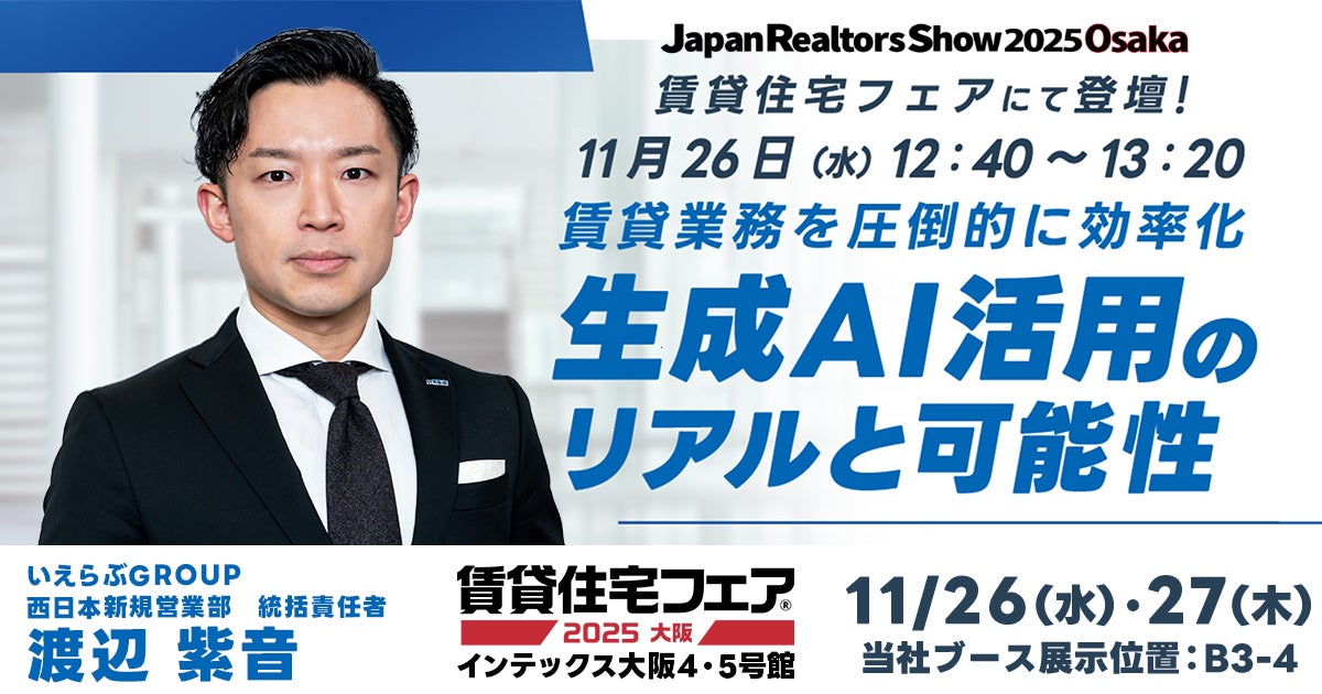 不動産業界特化のDX支援サービスを展開する、株式会社いえらぶGROUP(本社:東京都新宿区、代表取締役:岩名泰介、以下「いえらぶGROUP」)は、2025年11月26日(水)・27日(木)にインテックス大阪で開催される「賃貸住宅フェア2025大阪」に出展いたします。11月26日(水)には、いえらぶGROUP 西日本新規営業部 統括責任者 渡辺紫音がセミナーに登壇いたします。