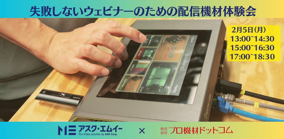 株式会社アスク M&E 事業部 (アスク・エムイー) は、2024 年 2 月 5 日 (月) に『失敗しないウェビナーのための配信機材体験会』を、株式会社プロ機材ドットコムとの協業で開催します。