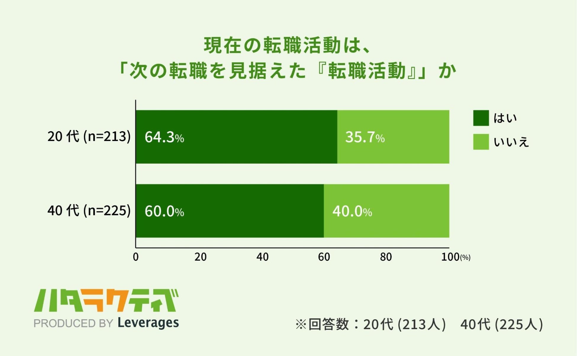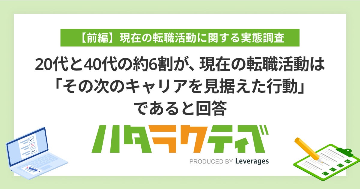 レバレジーズ株式会社が運営するフリーター・既卒・第二新卒向け就職支援サービス ハタラクティブ(https://hataractive.jp/ )は、若者のキャリアに関する実態を把握するため、20代と40代の正社員1,335名(20代:563名・40代:772名)を対象に、現在の転職活動に関する実態調査を行いました。