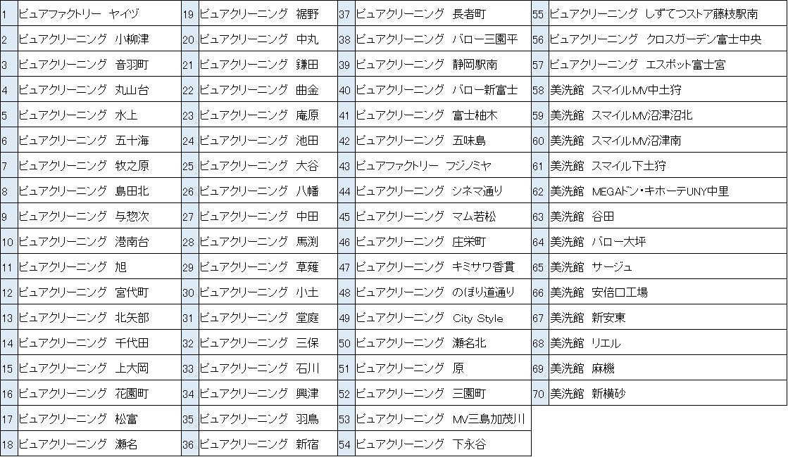 株式会社ジェーシービー (本社:東京都港区、代表取締役会長兼執行役員社長:浜川 一郎、以下:JCB)は、2022年8月18日(木)より、株式会社ホワイトウィングスリテール(本社:静岡県静岡市、代表取締役社長:中村 真治、以下:ホワイトウィングス)が展開するクリーニング「ピュアクリーニング」、「美洗館」の直営店70店舗(下記表)にて、JCBカード等の決済ブランドの取り扱いを開始することをお知らせいたします。また、準備が整い次第JCBのタッチ決済も順次導入予定です。