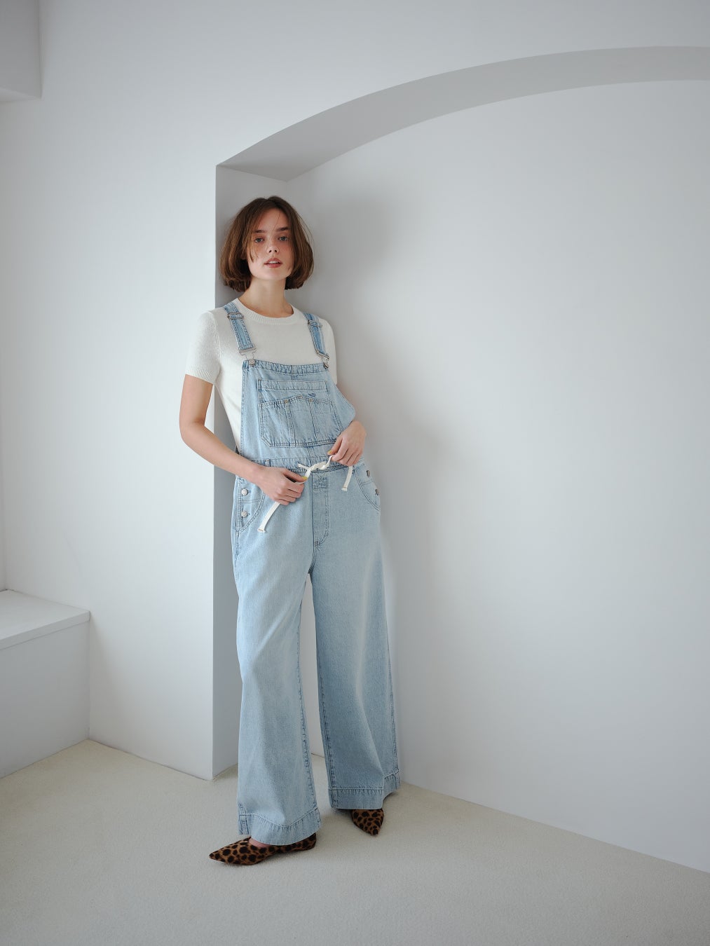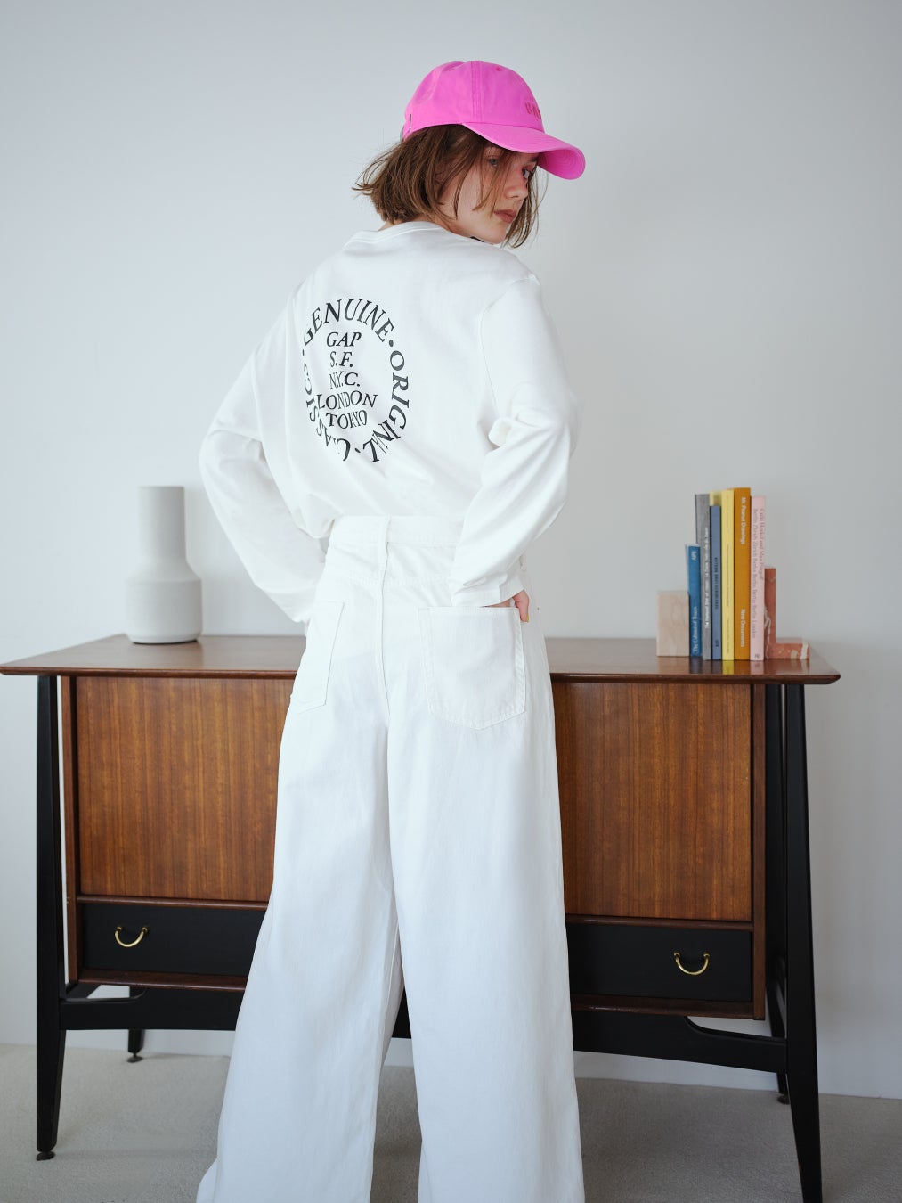 シンプルなワンツースタイルでも映えるホワイトルック。心地良いリラックス感と絶妙なムードを生むバギーデニムを軸に、半袖ケーブルニットを合わせてこの季節ならではのそぎ落とされた華やかさを。さらにトップスをメンズサイズのロゴTシャツにすることで洗練されたカジュアルスタイルも実現。