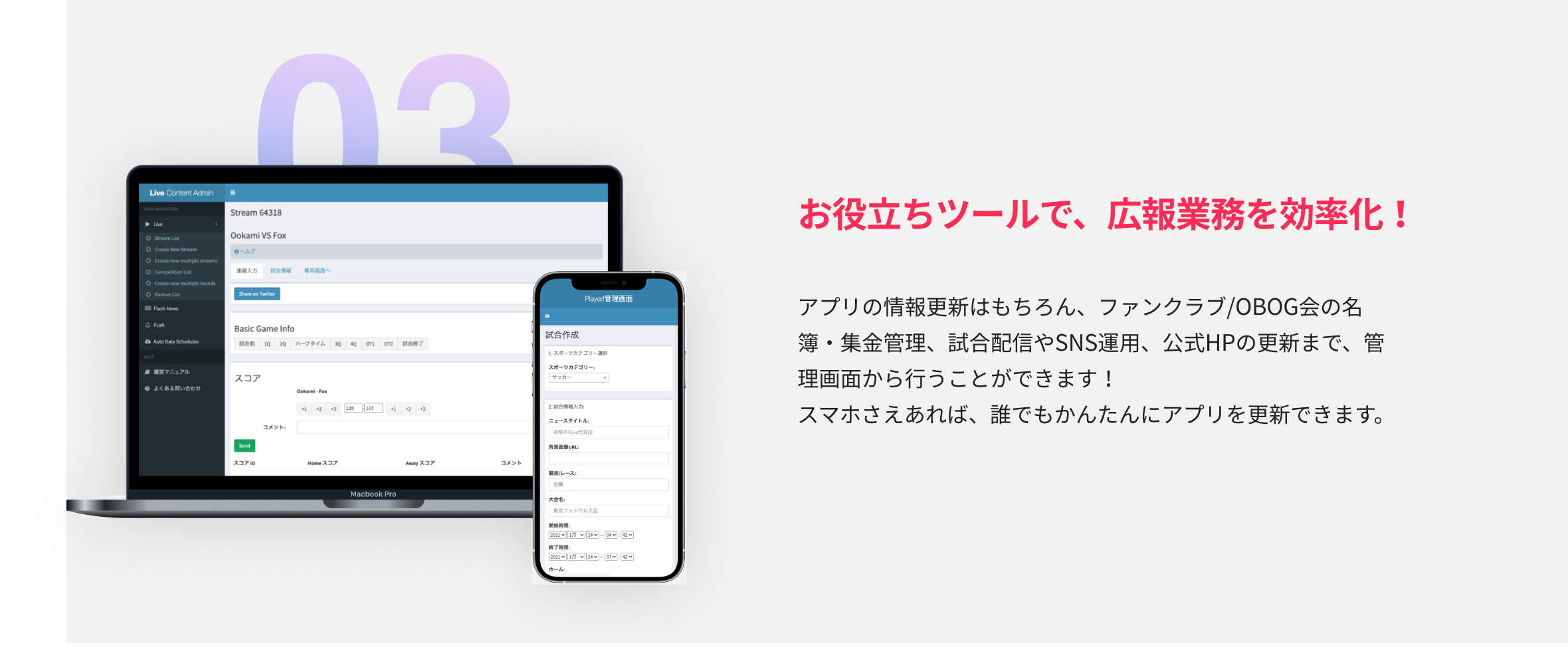 試合配信/応援、結果/日程/順位表、ファンクラブ、スポンサー枠がアプリに。