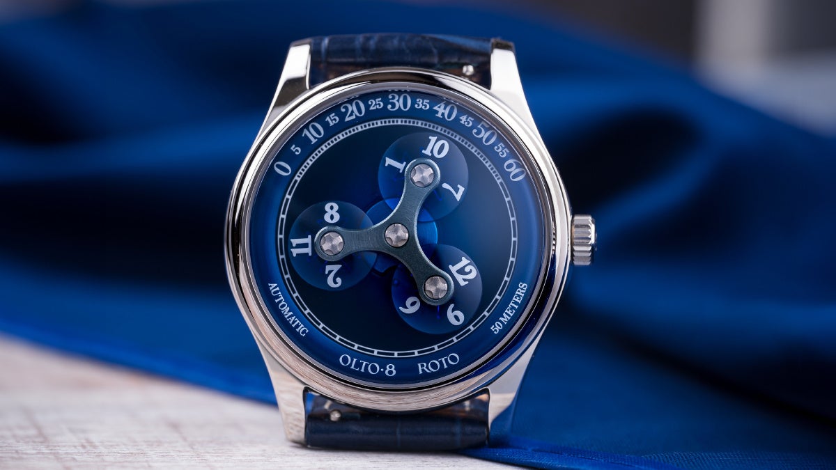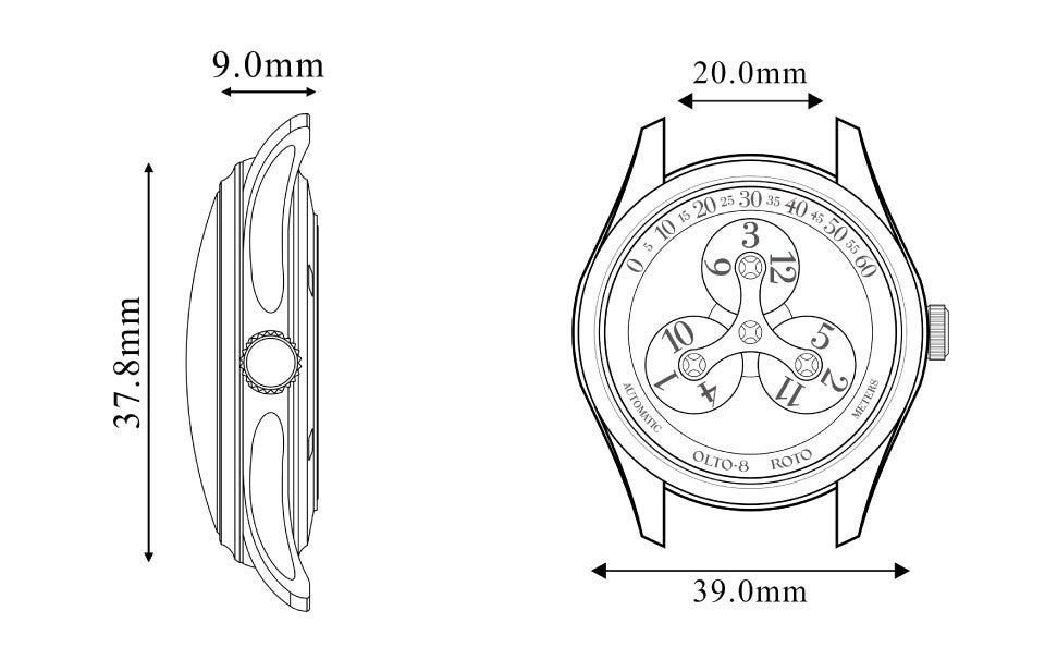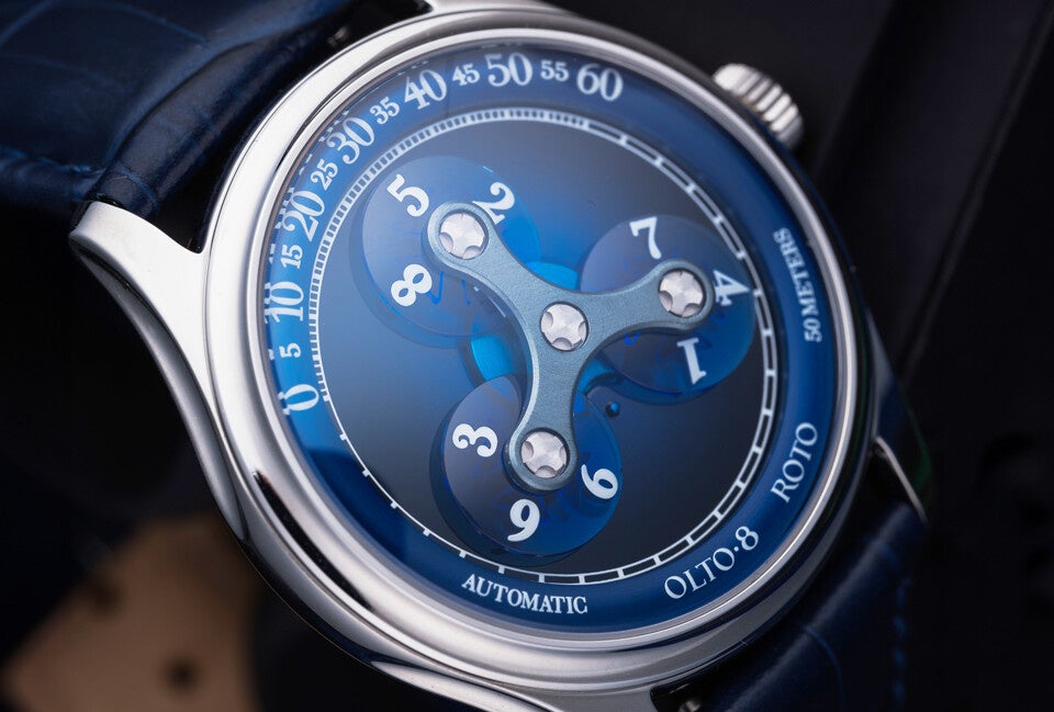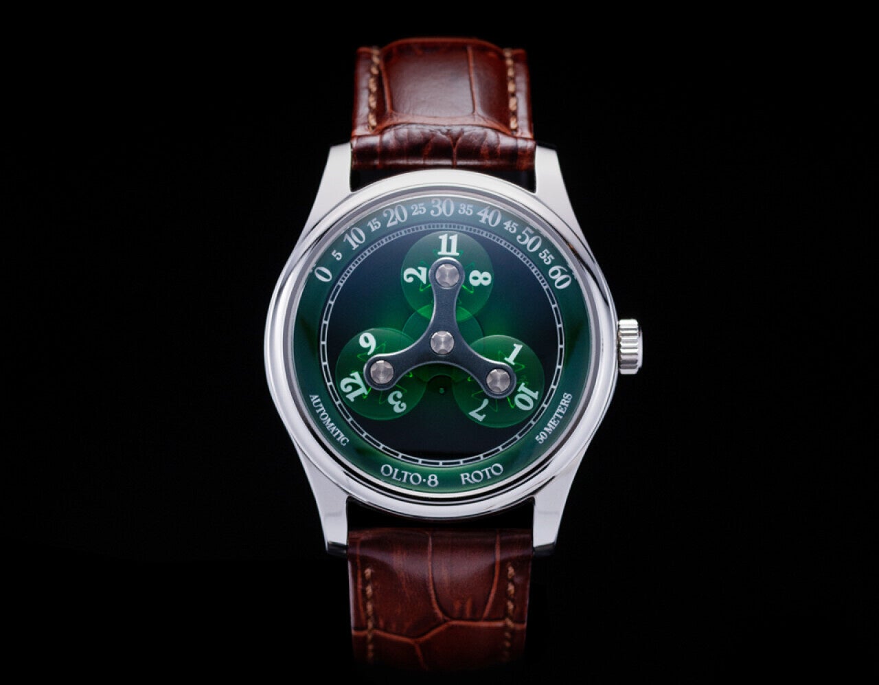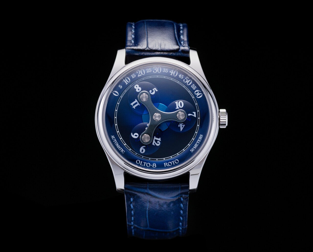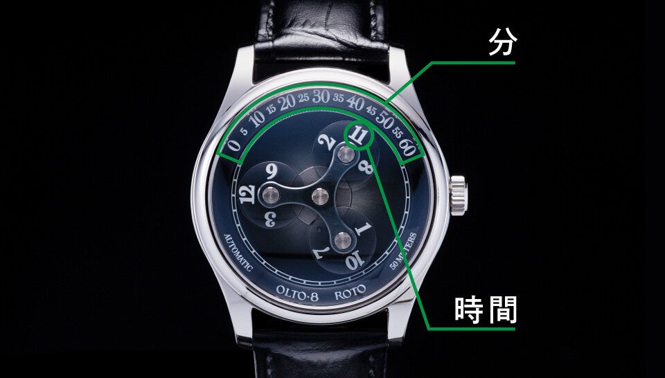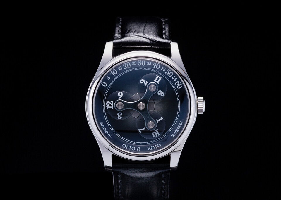「OLTO-8 ROTO(オルト8 ロト)」は自動巻き機械式ムーブメントを採用したワンダリングアワーウォッチ。数字が刻まれた3枚の円盤が回転して時を告げ、魅惑的で神秘的な効果を生み出します。