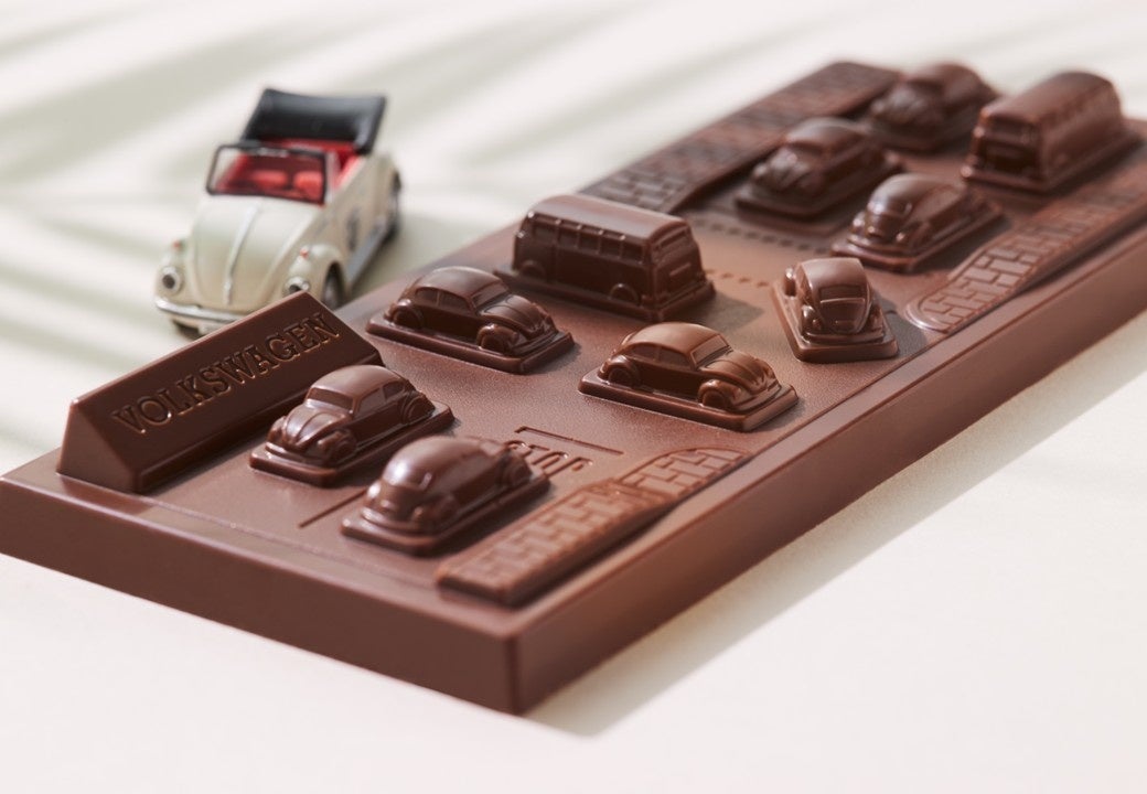 5つの味わいから1枚ずつピックアップして楽しめるビートルシルエットのプレート型チョコレート。ミニカーとお揃いカラーの、グリーンのチョコレートがポイント。