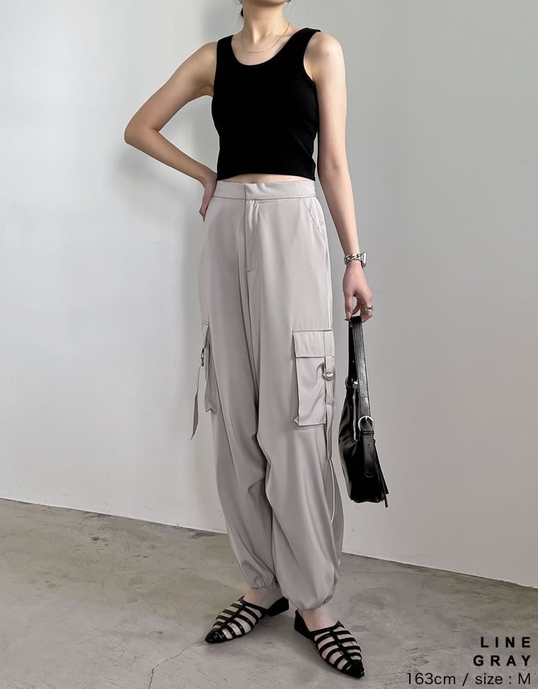 脚のラインを拾いにくいジョガーシルエット。絶妙な位置とサイズのカーゴポケットで脚長見え。落ち感がきれいな裾ゴム無しタイプも。