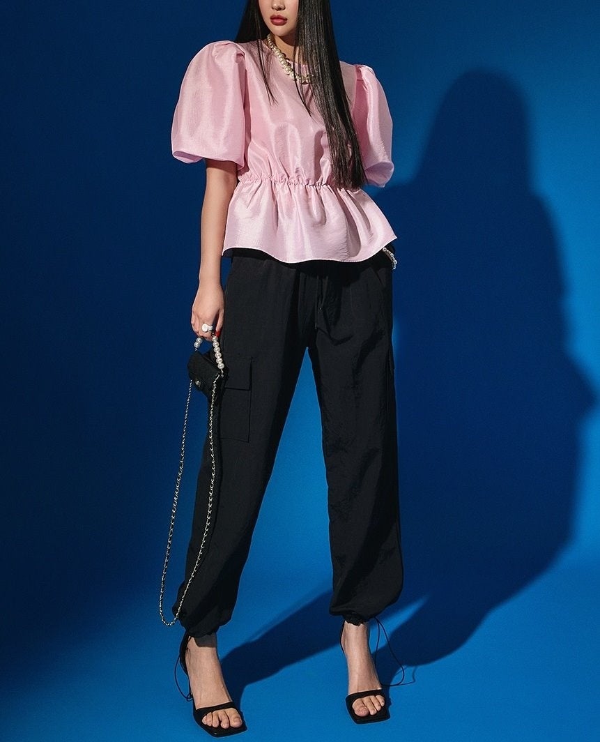 ハイウエストでやや細身のシルエットがスタイルアップ効果も。ボリューム袖のペプラムブラウスとハイヒールでモードなパーティースタイルに。