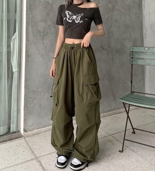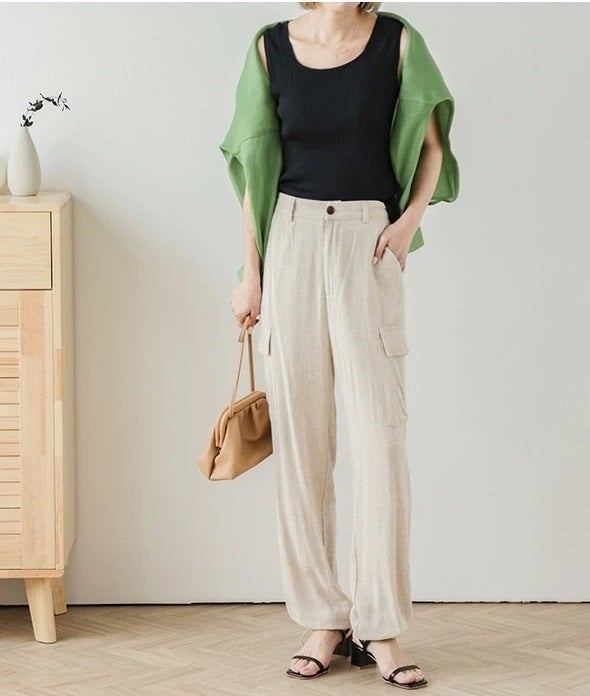存在感たっぷりのポケットやルーズシルエットでワークウェアやミリタリーなイメージがあり、カジュアル度が高いカーゴパンツ。今季は、サテンのような光沢感のある素材や裾のドロストデザインなど、大人の女性でも取り入れやすいきれいめなタイプが注目を集めています。足元は華奢なサンダルやヒールを合わせてスタイリッシュにまとめるのが今風です。初夏の装いをクラスアップしてくれるカーゴパンツを取り入れたコーデをご紹介します。