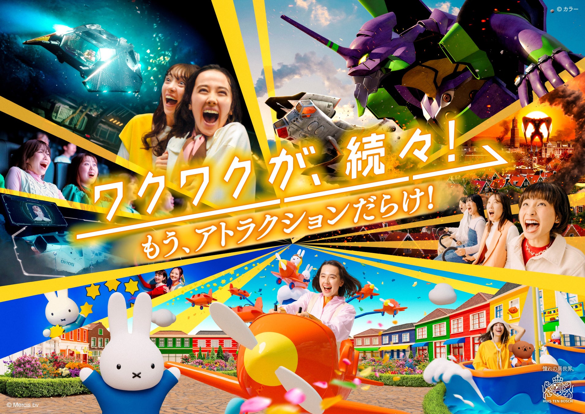 2024年3月に、深海をテーマにした没入型アトラクション「ミッション・ディープシー Xsenseライド」では、五感を刺激する没入体験が叶うライドアトラクションが登場いたしました。ミッフィー誕生70周年の記念すべき年でもある2025年の6月には、世界唯一(※3)のエリア「ミッフィー・ワンダースクエア」をオープン。絵本の世界に入り込むような没入体験や、国内初(※4)の常設グリーティング施設など、“カワイイ”が詰まった空間が誕生しました。さらに、今春に『ミッフィーセレブレーション』を開催し、ハウステンボスではミッフィーのエリアとともに、ミッフィーの世界を心ゆくまで満喫できます。続いて9月には日本初(※5)の爽快!超絶景ライド「エアクルーズ・ザ・ライド」がオープン。想像を超えるスケールと臨場感で、ゲストから大好評をいただいています。(同アトラクションは、2026年4月19日(日)をもって運営終了となります。)