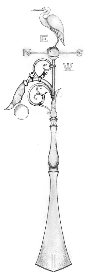 真鍮を1滴ずつ垂らして作られた「風見鶏」と創作活動の成果である「実」がロートアイアンで繋がる造形。街灯の要素は前作から引き継ぎ、タイマー式で点灯・消灯する。