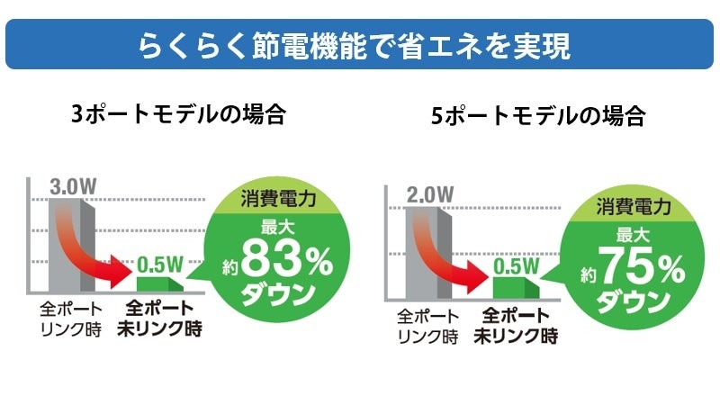 らくらく節電機能により接続していないポート、リンクしていないポートを自動的に判別し、電力供給を抑えます。パソコンがシャットダウンしている環境では、大幅な電力の節約を実現することができる、省エネ法に準拠したスイッチングハブです。