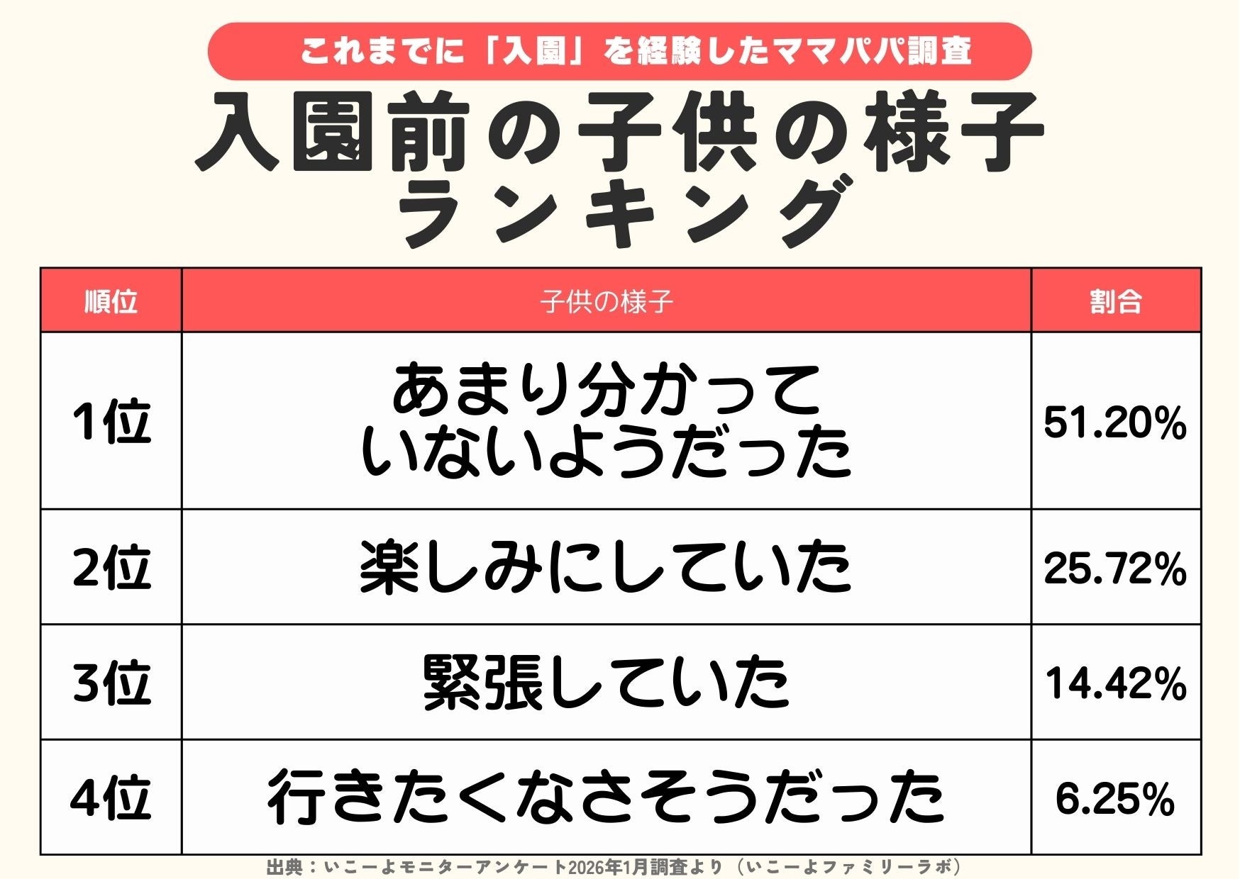 入園は子どもにとっても保護者にとっても大きな節目です。不安を抱えながらも、それぞれの家庭なりの方法で準備を進めているリアルな姿が浮き彫りとなりました。