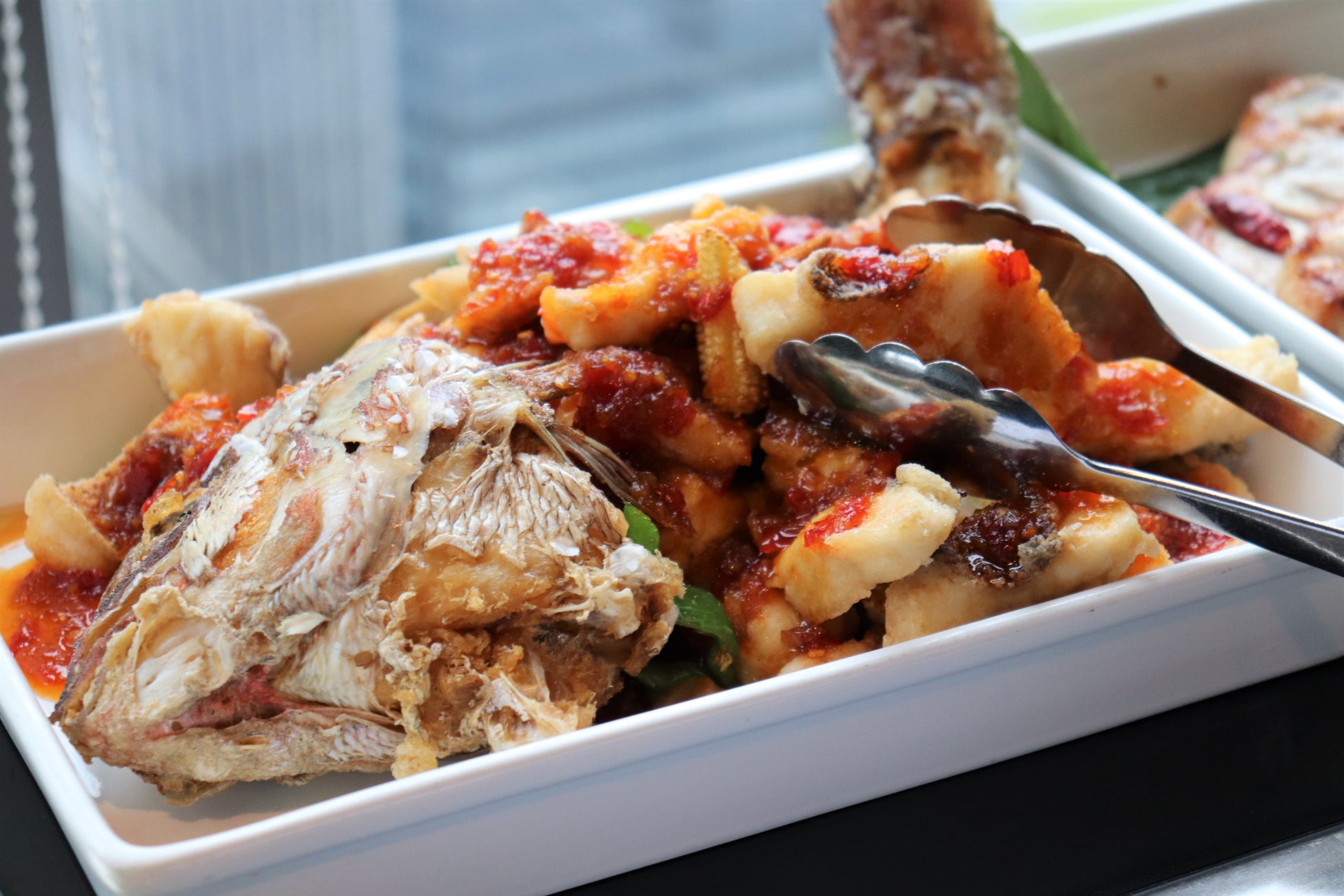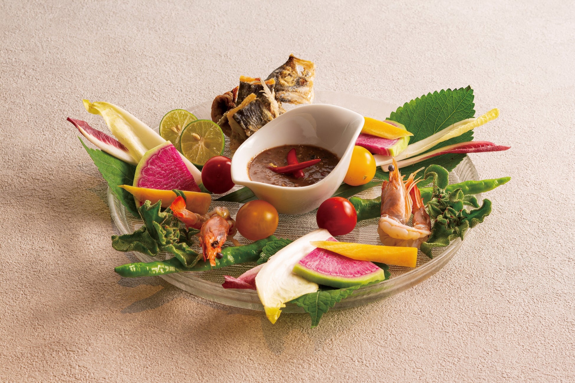 タイ人にこよなく愛される伝統的なメニューを、天使の海老、鯵、甘長唐辛子、紅芯大根、アイスプラント、チコリ、プチトマト、ニンジン、エゴマの葉を使って、マンゴツリー東京ならではの洗練されたスタイルでお届けいたします。スパイシーなだけでなく、“カピ”の醸し出す海老の旨みや塩味、タイライムの爽やかな酸味が絶妙なソースが、野菜の甘さや魚介の旨味を引き出してくれる、タイらしい一皿です。※仕入れの都合により食材が変更になる場合があります