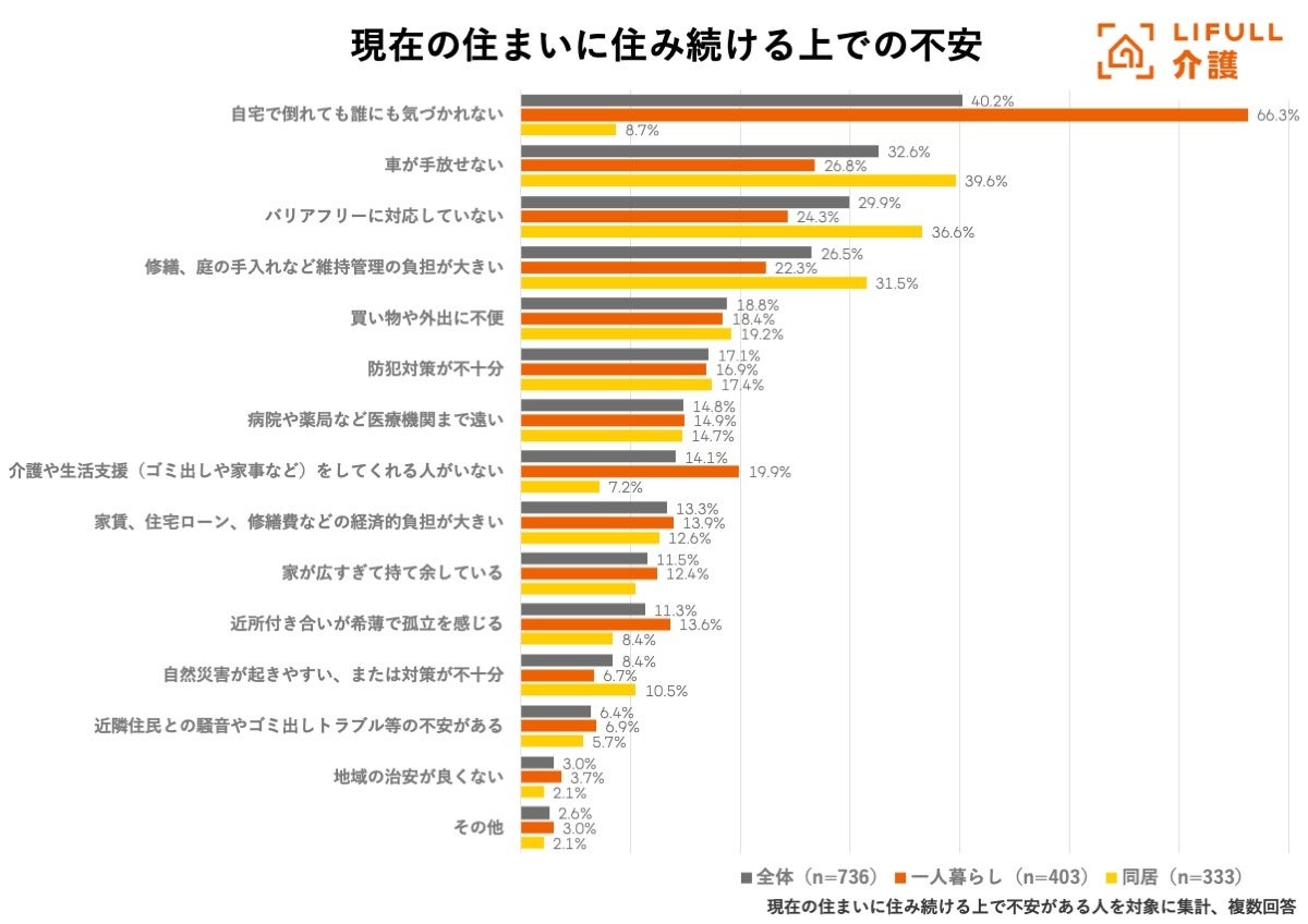 約7割は現在の住まいに不安。一人暮らしの不安、最多は「自宅で倒れても誰にも気づかれない」。また同居、一人暮らし問わず「車が手放せない」ことを不安視