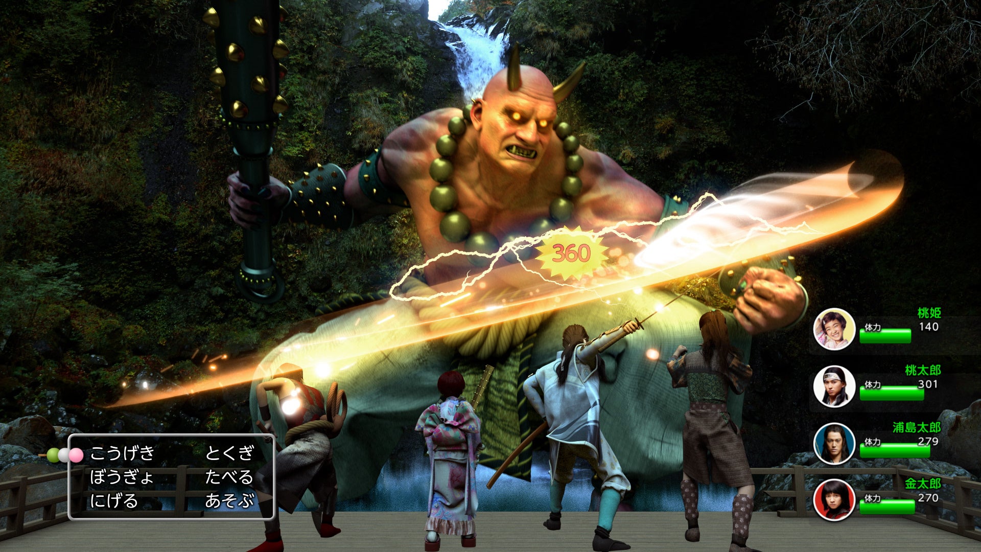 渋谷の街中で待ち合わせの合間にスマホでRPGゲームをしている女の子。彼女の手元のスマホ画面には、なんとゲームの世界に入り込み山道を走っている桃太郎と桃姫の姿が。ゲームの世界では今にも襲い掛かってきそうな巨大な熊が二人の前に立ちはだかります。画面上に現れたコマンドから、『にげる』を選択、二人はUターンして一目散に走って逃げるのでした。人通りが多い道までくると、二人は浦島太郎と金太郎に出会います。コマンドで『話しかける』を選択すると、二人は笑顔でうなずいて『一緒に行く』と答え、仲間に加わりともに鬼退治の旅へ出ることに。四人で旅をはじめた最中、桃姫が茂みの中に宝箱を見つけ、アイテム『鬼の金棒』をゲットします。シーンが変わり、今度はきれいな滝にたどり着いた四人。感動しているのも束の間、空から突如大きな金棒を持ったボスの鬼が現れます。三太郎と桃姫は各々の武器をかまえてコマンドの『こうげき』を選択、金棒で豪快に攻撃してくる鬼に対して、桃太郎は刀を振り、浦島太郎はまわし蹴り、金太郎は斧を振り回し、桃姫はゲットしたアイテムの『鬼の金棒』を振りかざします。その頃、別々の場所にいながらも三太郎たちを応援するかぐや姫、織姫、乙姫、鬼ちゃん、親指姫たち。その応援がなんと光となって桃姫の金棒の先端に集まります。皆からの応援の光を集めた金棒で振りかざした桃姫の渾身の一撃は強烈な光を放ち、鬼を滝つぼの底へと沈めます。全員が集合して桃姫を讃えるシーンと共に、きれいな虹がかかる印象的なエンディングでCMは幕を閉じます。