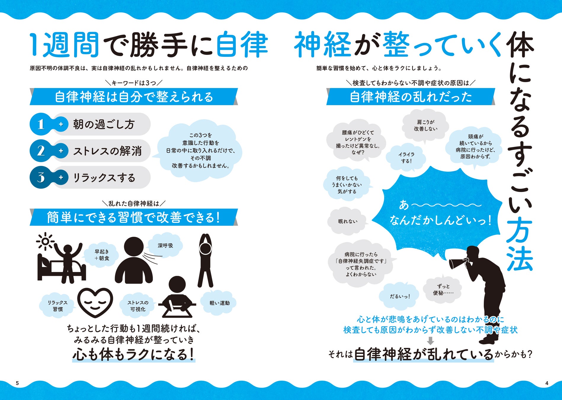 そんな“自律神経の乱れによる症状”に悩む人に向けて、自律神経の名医が“たった1週間で勝手に自律神経が勝手に整っていく体になる究極のプログラムを”開発!これまでの自律神経の研究の中から、効果的な方法を厳選し、それを日々の生活に取り入れることで自然と心身のストレスが消えていきます。