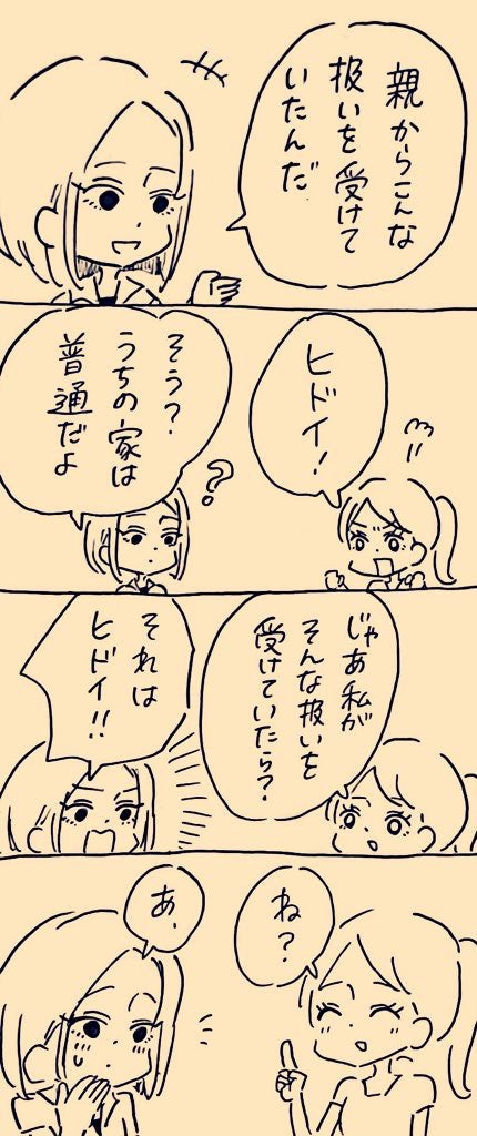 「普通」はふしぎな言葉です。なにが「普通」なのか、本当はよくわからないのだけど、「普通」と言うと、そこにあった色々な気持ちを麻痺させることができる。それはつまり、どんなに嫌なことであっても、それに慣れてしまって、当たり前だと思って、絶望している自分が「普通だよ」と言っているということなのでしょう。だから、誰かが「それはヒドイ」と言ってくれると、本当に助かる。
