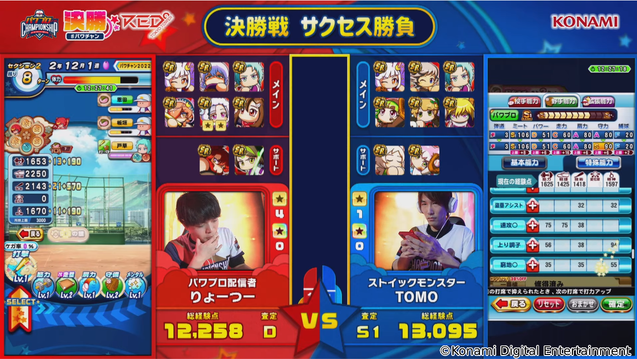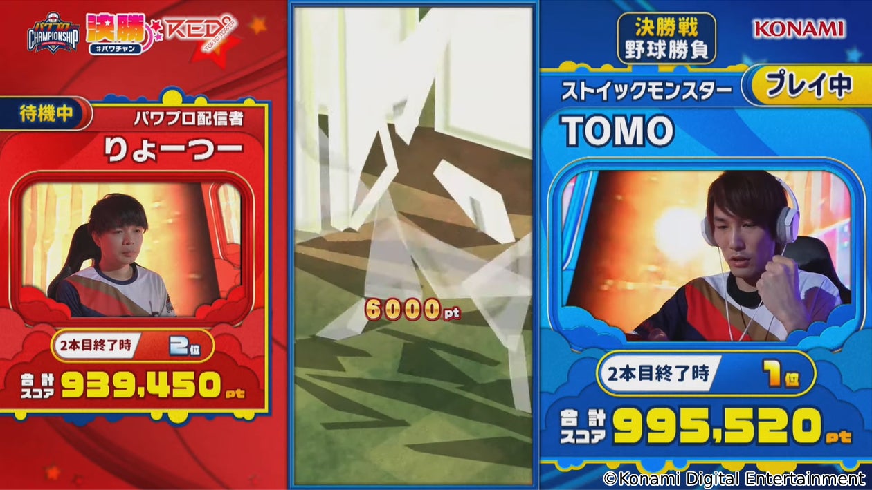 予選を勝ち抜いた4名とオンライン選抜枠3名、そして昨年の優勝者の計8名で争われた決勝大会。TOMO選手とりょーつー選手が決勝に駒を進め、「サクセス勝負」と「野球勝負」の合計スコアでチャンピオンの座を競いました。「野球勝負」では両者見事なプレーを見せましたが、「サクセス勝負」で点差を付けていたTOMO選手が新王者に輝きました。