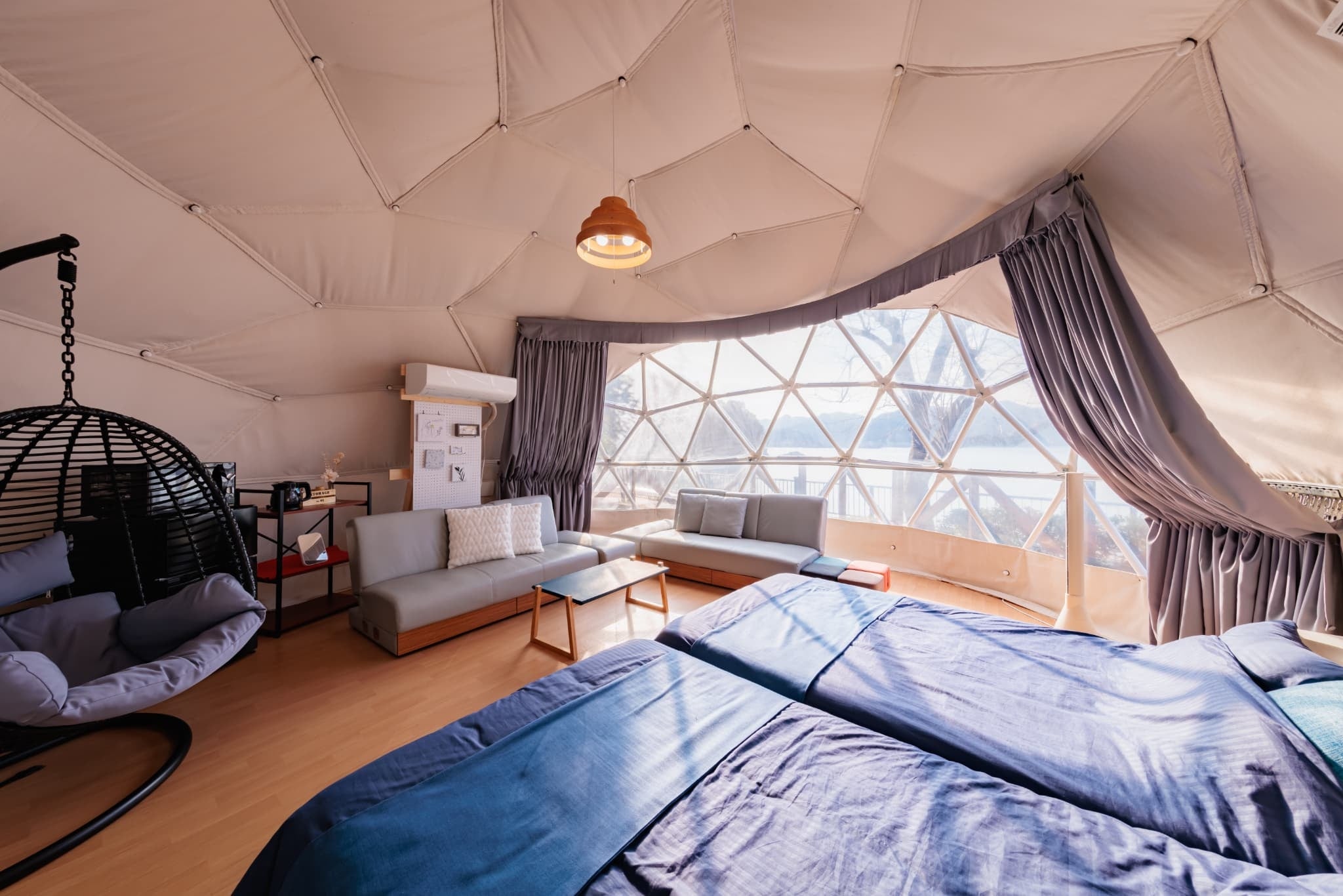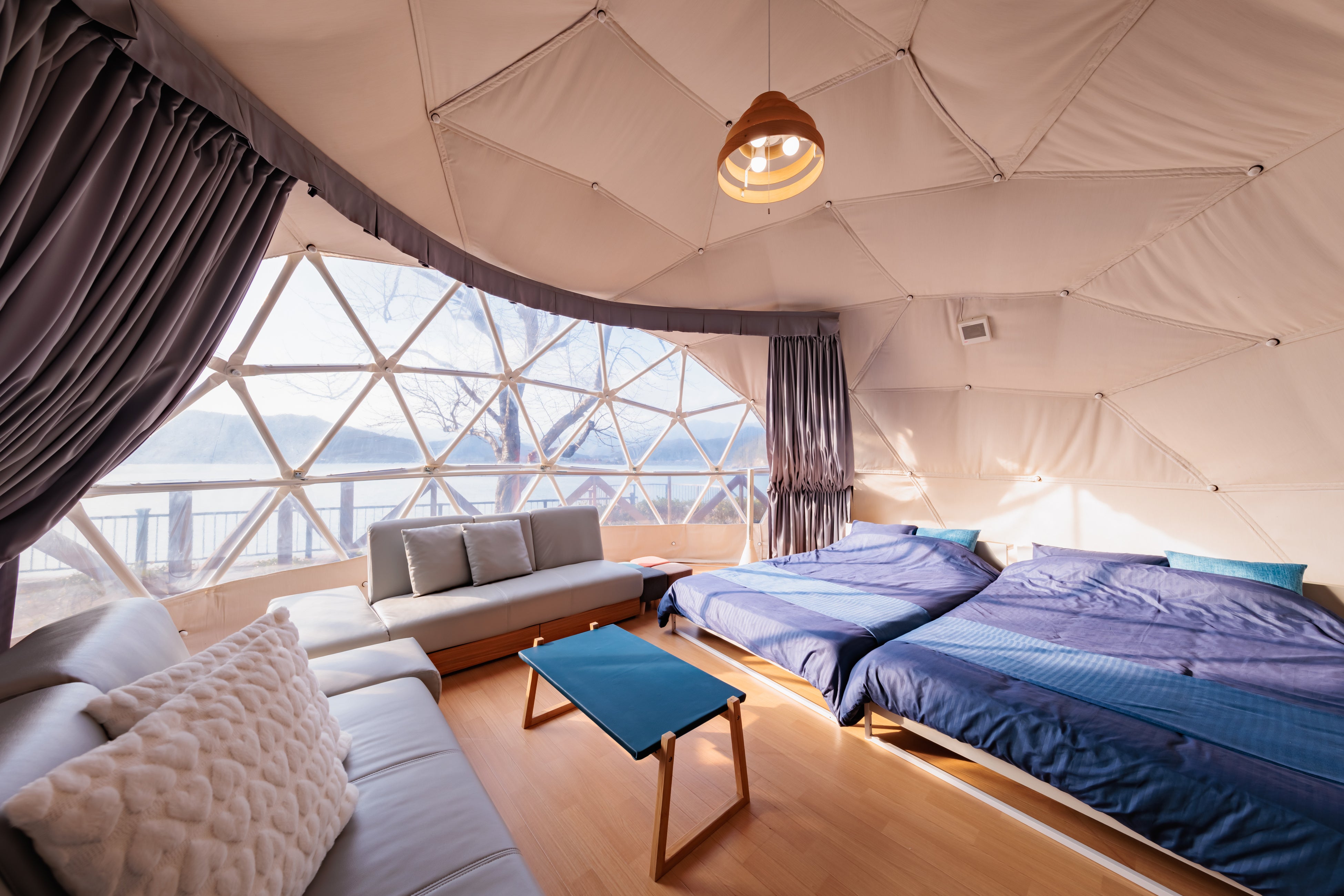 広々とした大型ドームテントは、急な天候不順が起こっても安心の設計。雨天、強風時でも安心してご滞在いただけます。全てのドームテントにはエアコンを備え、一年中快適なグランピングをお楽しみいただけます。