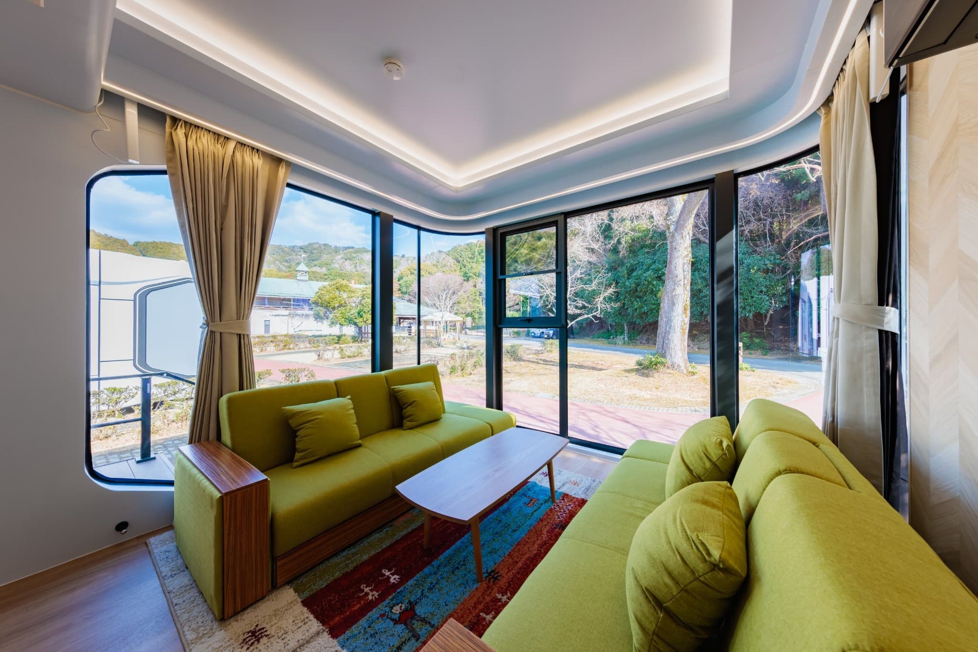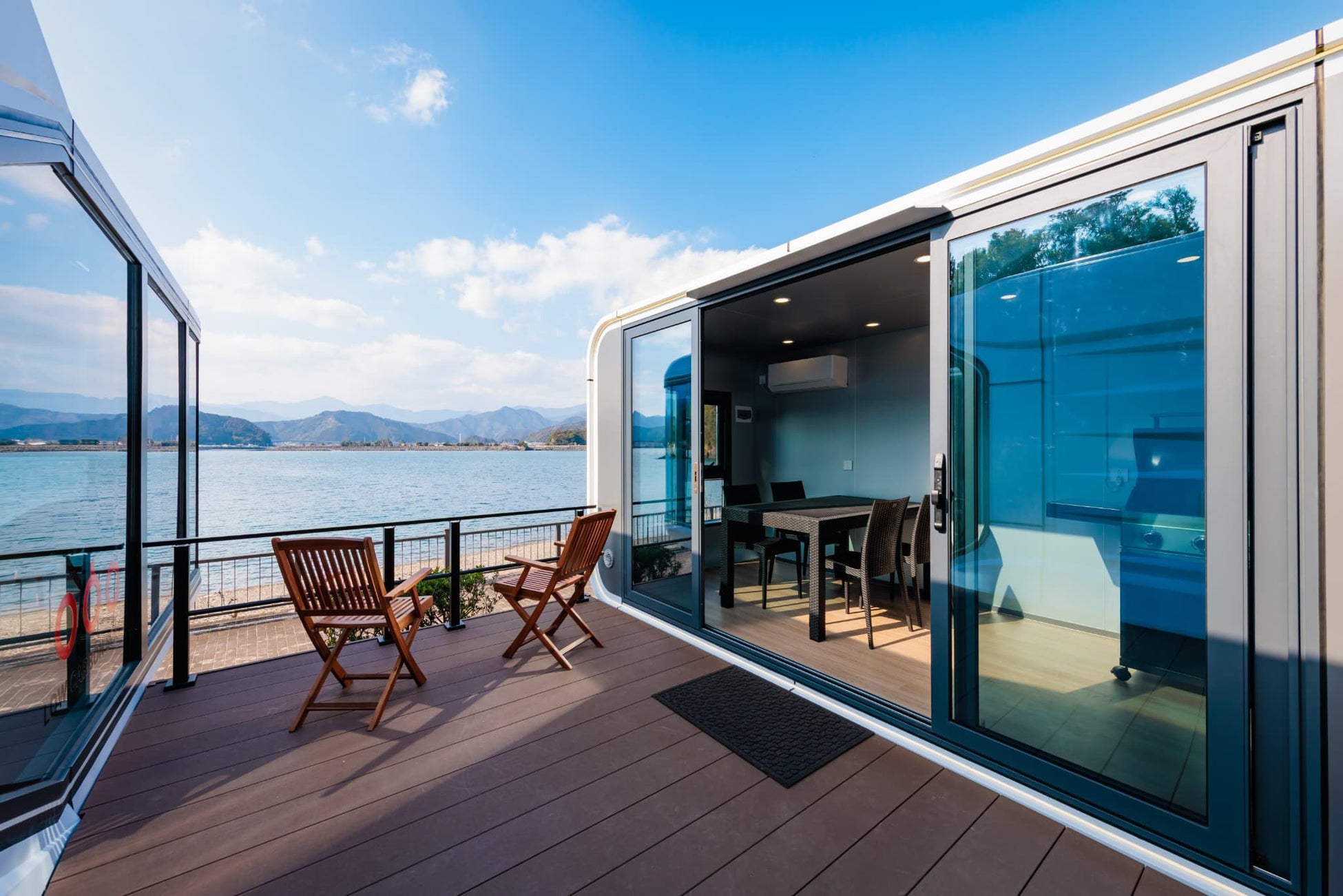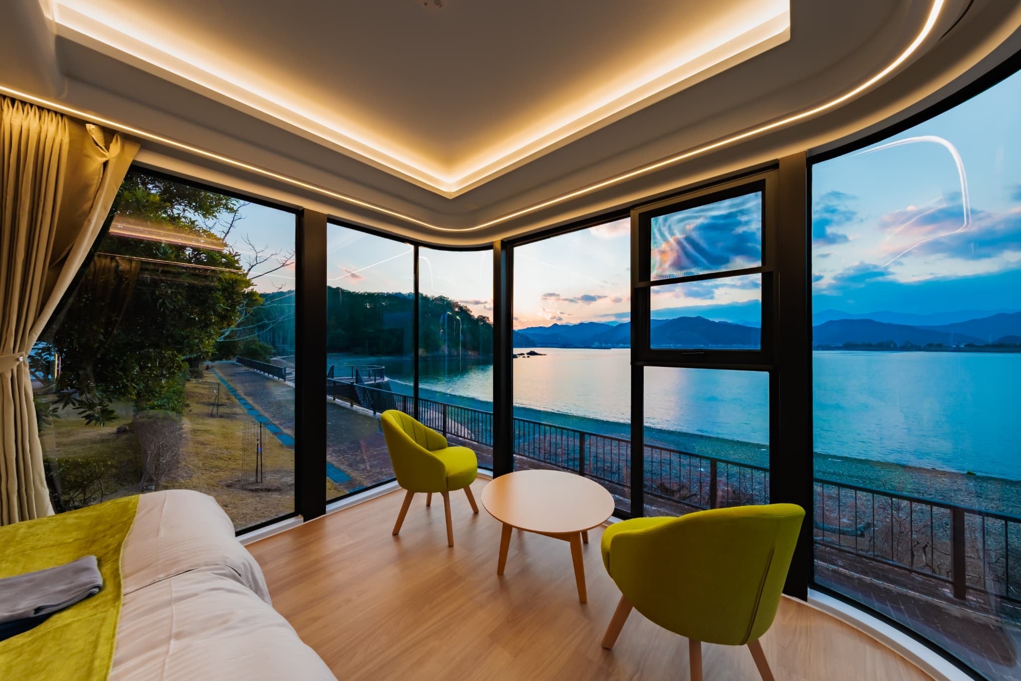 国内でもこのサイズのカプセル宿泊棟は非常に珍しく、シーサイドグランピング孫太郎でしか体験できない特別なお部屋です。海と山がパノラマウィンドウいっぱいに広がり、自然との一体感を味わえる特別な空間に。シャワールーム・トイレ・BBQスペースも完備し、快適な滞在を実現。