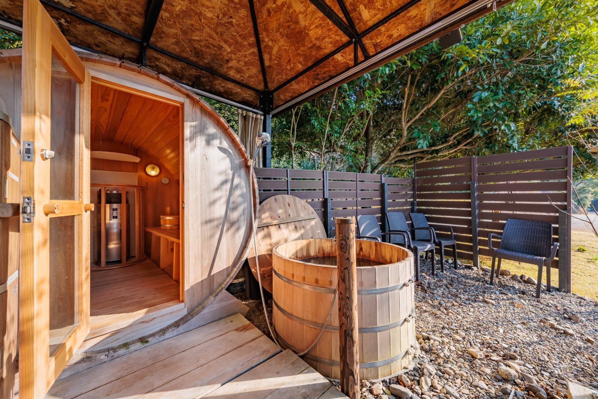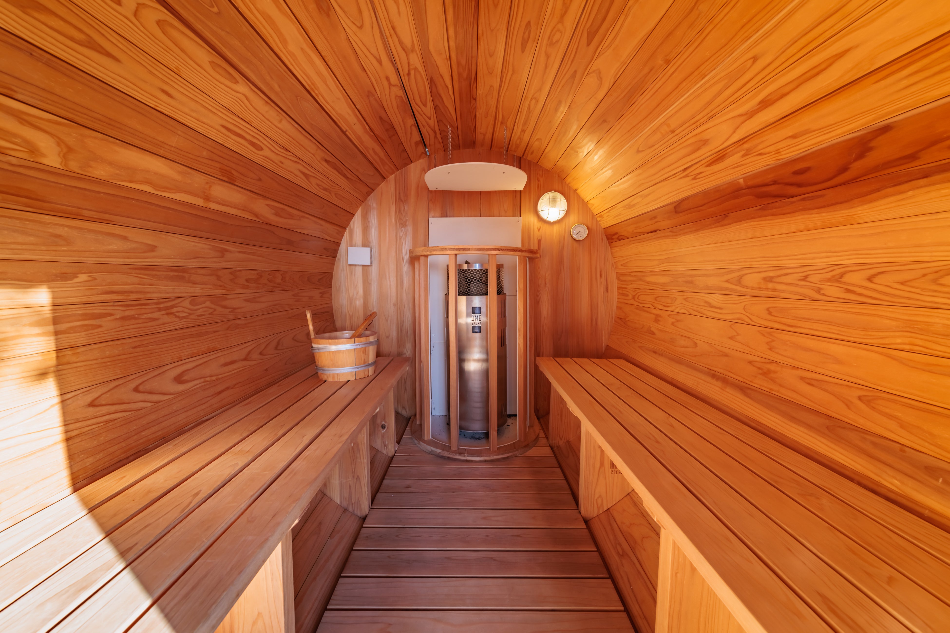 今流行の樽型木製サウナ(バレルサウナ)を導入。疲労回復や美白効果などが期待でき、大人気。