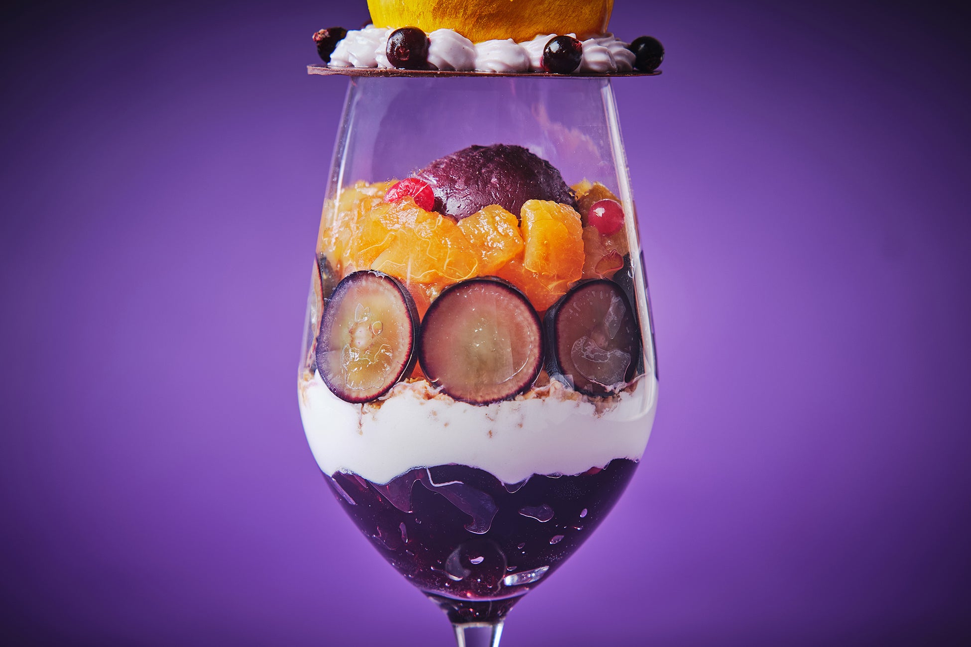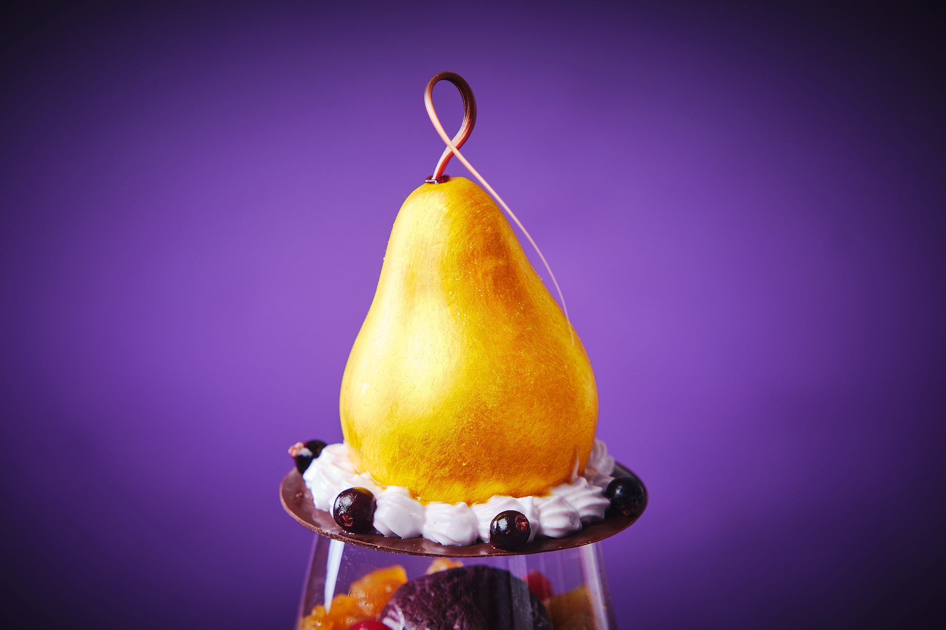 旬を迎える巨峰と洋梨をアレンジした「巨峰と洋梨のパフェ」のグラス内には、上から瑞々しい巨峰のシャーベット、その周りにキャラメルでコンポートした大人の味わいの洋梨、グロゼイユ、香り豊かな甘みとコクが魅力のナガノパープルのスライス、洋梨のカスタードクリームをギュッと詰め込みました。さらに下の層には、上層の甘みに対してアクセントとなるクリスピーな食感のホワイトチョコレートクランチ、まろやかな酸味のヨーグルトシャンティ、爽やかで上品な巨峰のジュレを配し、異なる食感を演出。グラスのトップはパリっと軽い食感のチョコレートで蓋をし、その上にカシスのシャンティ、ゴールドカラーが華やかな洋梨のシャンティを中に忍ばせた洋梨の飴細工をのせてアーティスティックに仕上げました。食べ進めるごとに味わいと食感の変化を楽しめ、香り豊かでコクのある巨峰と様々な素材と組み合わせてアレンジした洋梨が織りなす秋らしさ満点のマリアージュをご堪能いただけます。