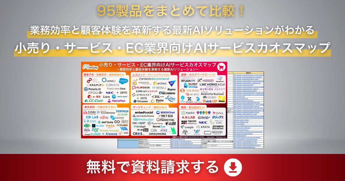 AIポータルメディア「AIsmiley」を運営する株式会社アイスマイリー(東京都渋谷区、代表取締役:板羽 晃司)は、業務効率と顧客体験を革新する最新AIソリューションをまとめた「小売り・サービス・EC業界向けAIサービスカオスマップ」を、2025年11月17日(月)に公開しました。掲載総数は95製品です。