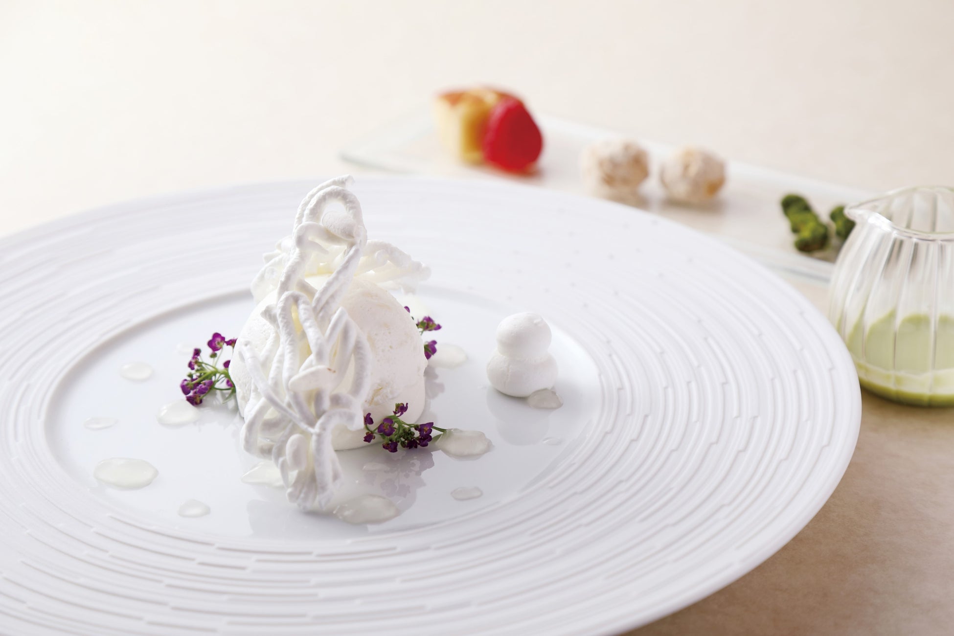 当ホテルの料理人、小林 もえにより考案されたこの一皿は、和食の基本と言われる「一汁三菜」をデザートプレートで表現しています。「米」はクリームチーズにライスパフを加えたアイスの上に、米を使用したムースを乗せ表現。アイスの横には、メレンゲの雪だるまを添えています。「一汁」は抹茶のスープで、「三菜」は赤・黄・緑の三色のプティフール(ひと口サイズのお菓子)で表現しています。