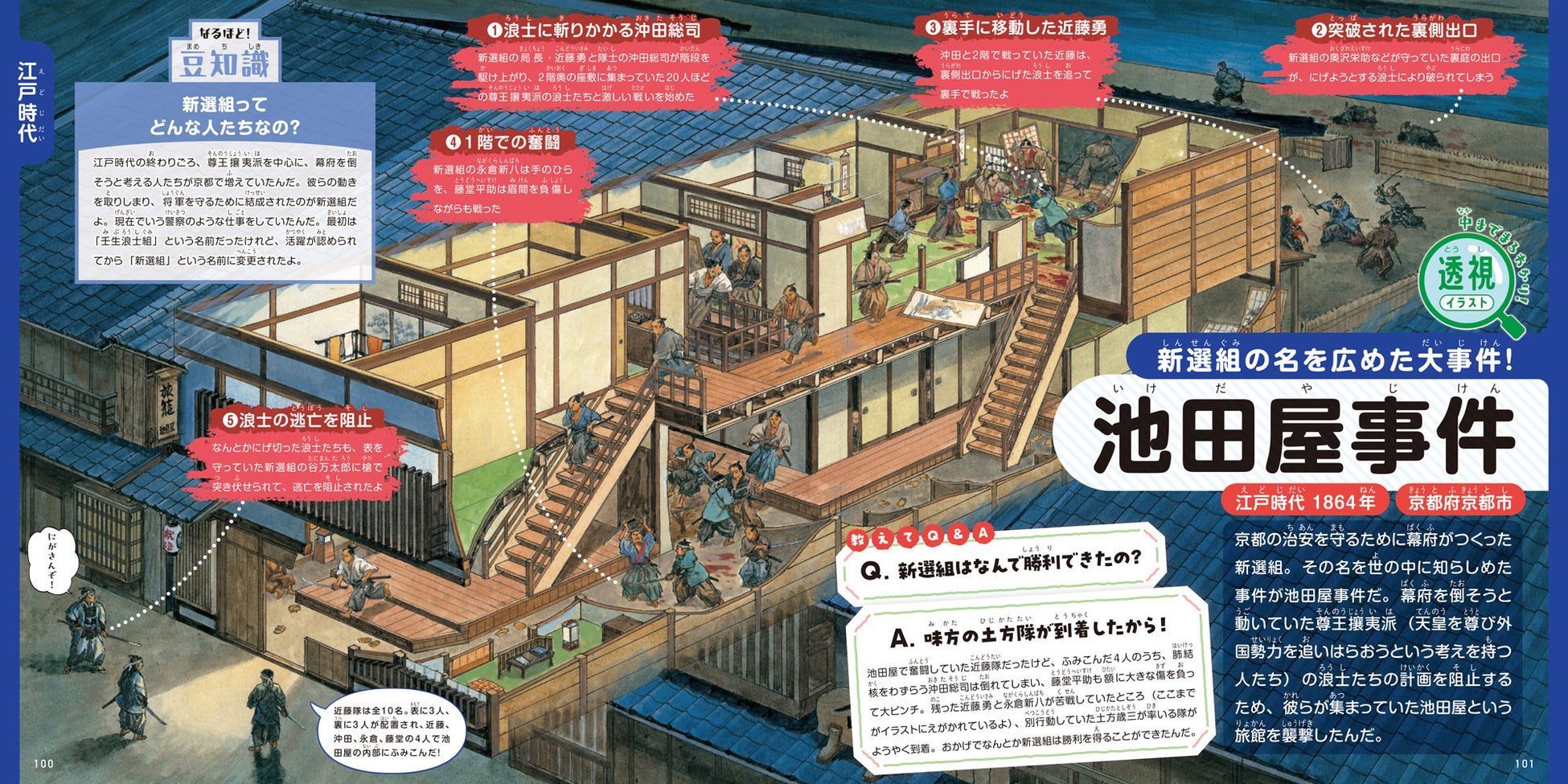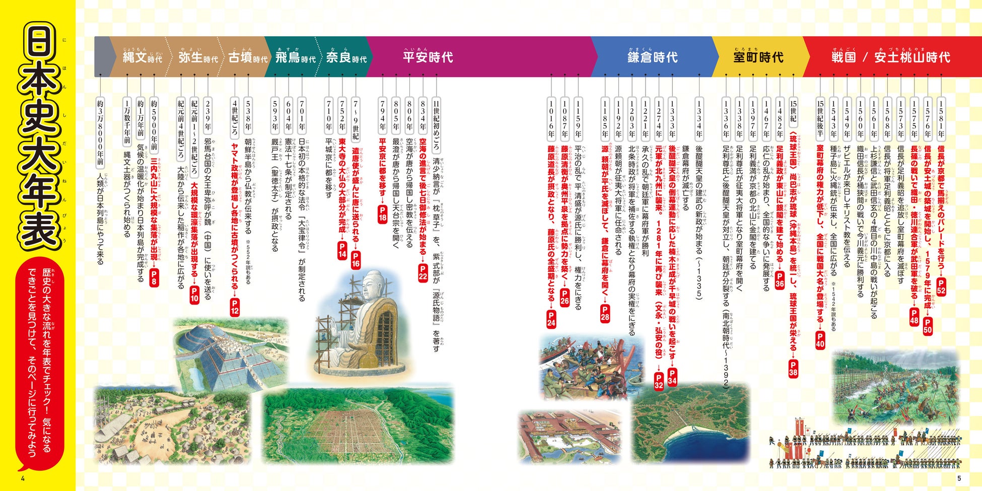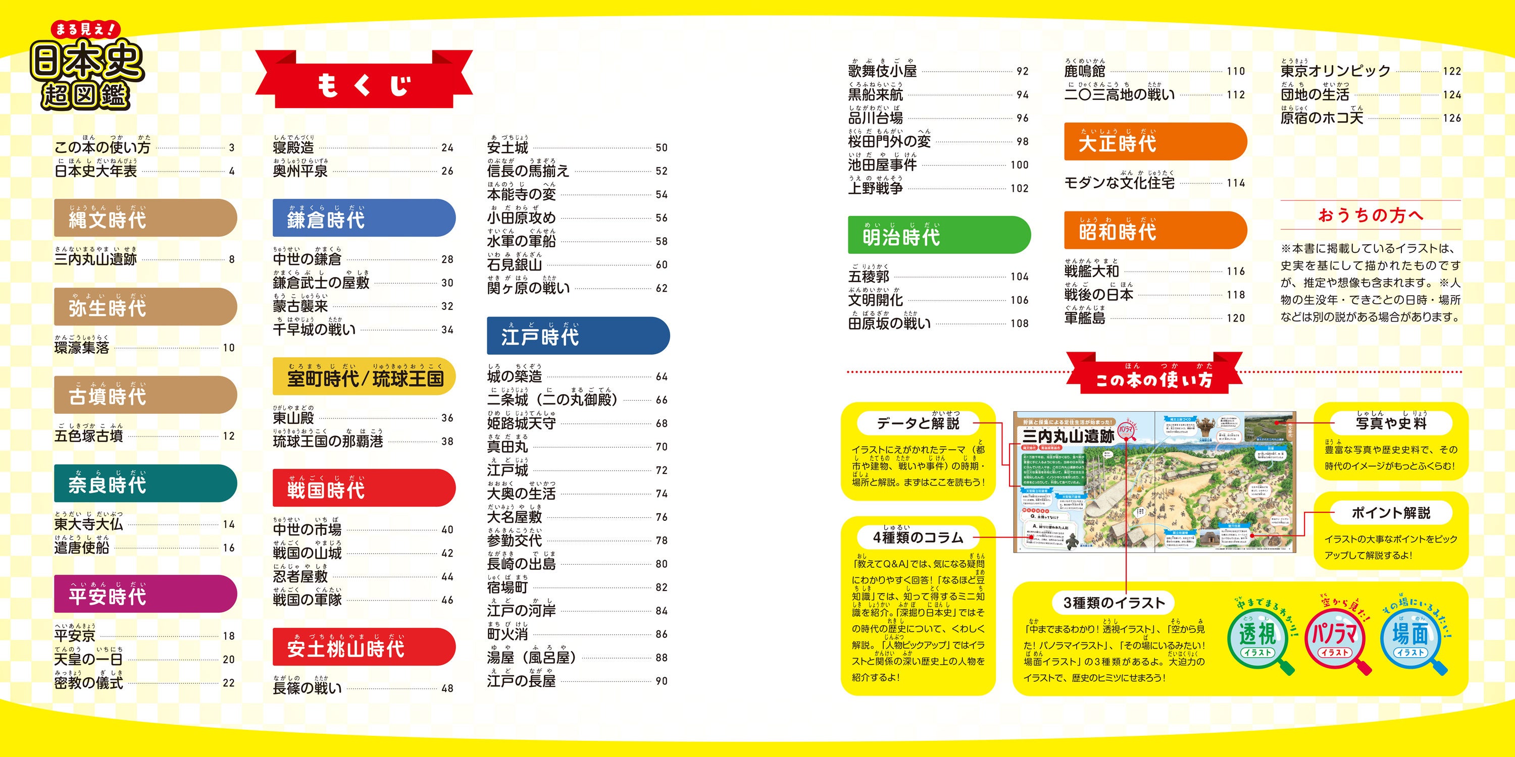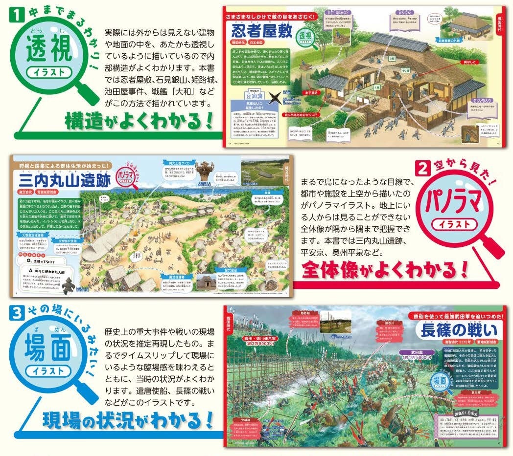 「透視」「パノラマ」「場面」の3種類のイラストによる徹底図解で日本史がますます楽しくなる! 歴史雑誌の編集部がつくった小学生向け日本史図鑑が登場!