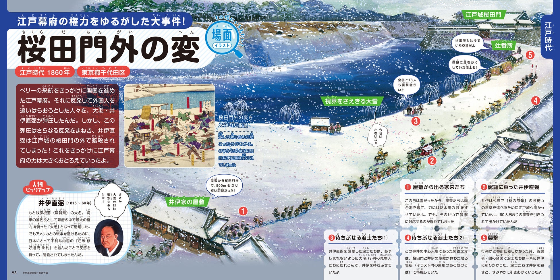 本書では全60のテーマが、以下の3種類のイラストのいずれかの方法で描かれています。1. 中まで見える「透視イラスト」、2. 空から見た状態で描かれた「パノラマイラスト」、3. その場にいるかのような臨場感あふれる「場面イラスト」。たとえば「忍者屋敷」は透視イラストで描かれているので、いろんな仕掛けがあることがとてもよく理解できます。また、「平安京」はパノラマイラストで描かれているので、平安京が置かれた地形と主要な建物の配置、その広大さがわかります。「桜田門外の変」は場面イラストで描かれているので、井伊直弼の行列が江戸城外のどのあたりでどのように襲われたかが、事件を目撃していたかのように見て取れます。