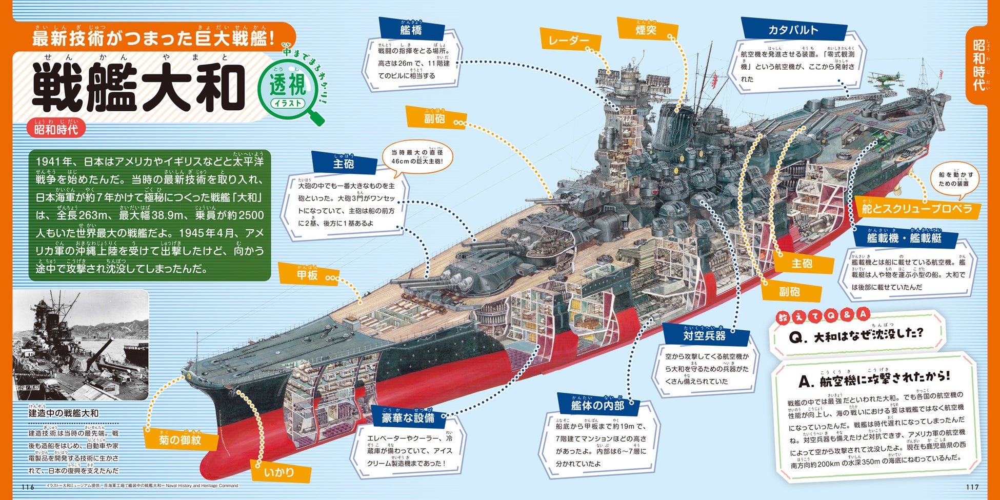 本書のイラストを描いているのはいずれも歴史再現イラストの第一人者ばかり。ベストセラー「迷路絵本」の香川元太郎さん、鳥瞰イラストの第一人者・黒澤達矢さん、軍装などのイラストでも名高い中西立太さん、船のイラストの第一人者・谷井建三さんほか計7人の名手たちのイラストで構成されています。