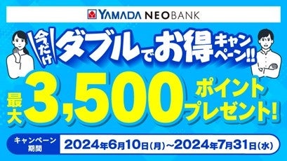 株式会社ヤマダホールディングスのグループ企業である株式会社ヤマダデンキ(本社:群馬県高崎市、代表取締役社長:上野 善紀、以下、ヤマダデンキ)は、提供している銀行サービス「ヤマダNEOBANK」において、2024 年6 月10 日(月)より「今だけダブルでお得キャンペーン」を開催いたします。