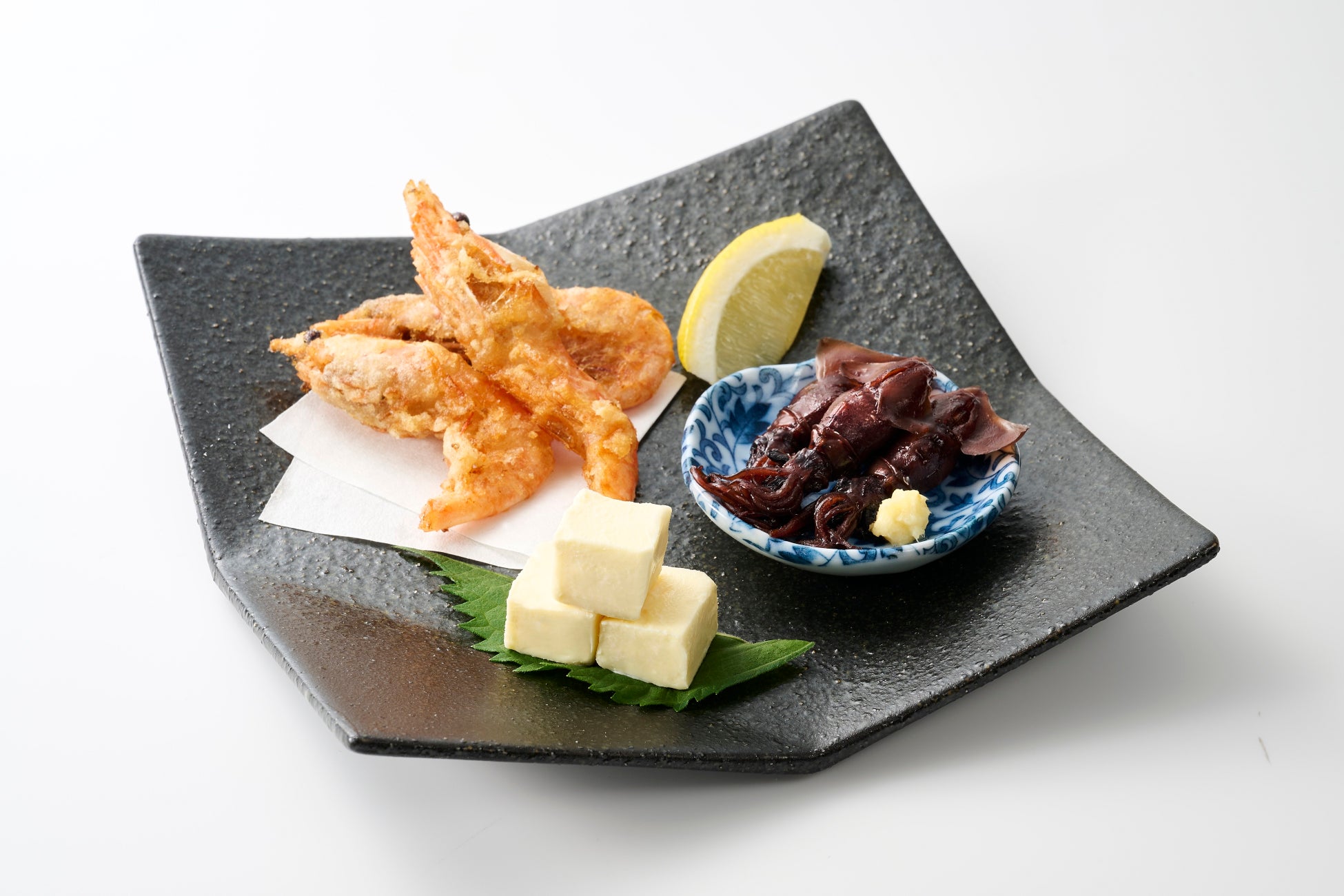 ほたるいか生姜煮・酒粕のクリームチーズ 甘えびから揚げの3点盛り