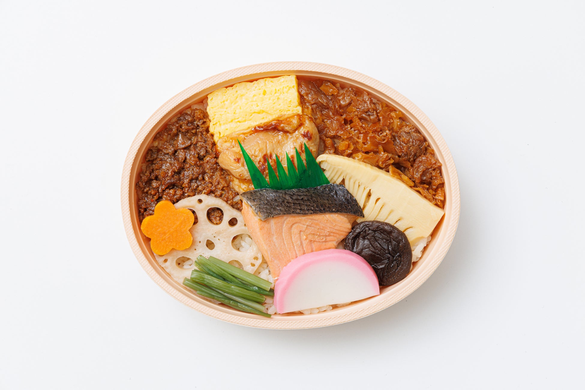 石川産「能登牛」のそぼろや、福井産「ふくいサーモン」の煮付け、富山産「花びら茸」の佃煮など、北陸 三県の幸を盛り合わせました。 (10月31日からJAグループ石川と連携し、石川県ブランド米「ひゃくまん穀」を使用予定)