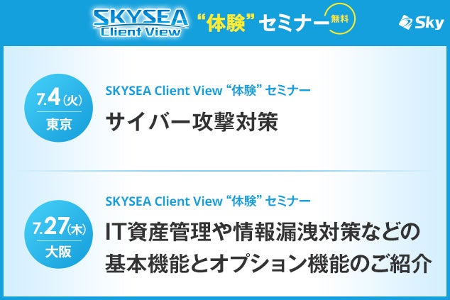 7月開催のセミナーでは、ランサムウェアなどのサイバー攻撃に関する動向や対策、「SKYSEA Client View」の活用術などについて、実機操作を交えてご紹介するセミナーを開催いたします。受講費は無料です。ぜひご参加ください。