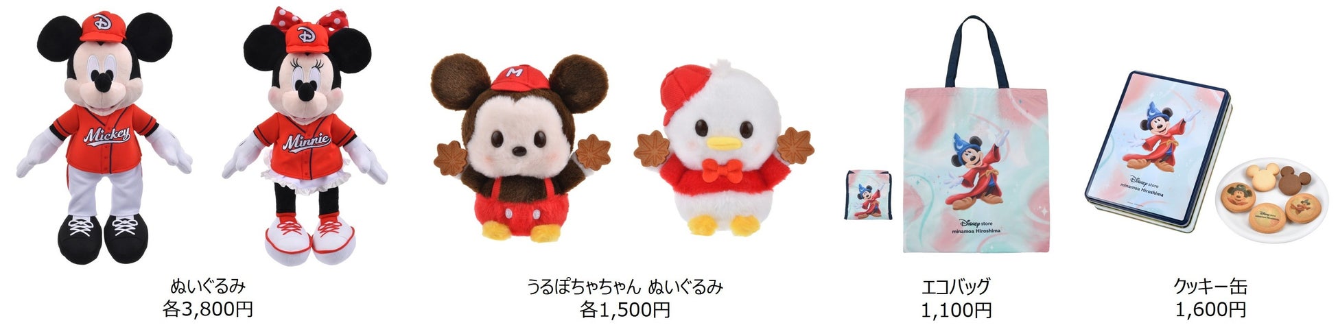 グランドオープンを記念して、お土産やコレクションとしてもぴったりなミナモア広島店限定アイテムを発売します。野球のオリジナルユニフォームを身に着けたミッキーとミニーのぬいぐるみやぬいぐるみキーチェーン、「うるぽちゃちゃん」からは広島県を代表する銘菓のもみじ饅頭を手に持った愛らしいぬいぐるみが登場します。さらに、「魔法使いの弟子」に扮したミッキーと店舗名をデザインした、パステルカラーがキュートなエコバッグやショッピングバッグ、クッキー缶もご用意します。