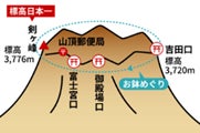 七合目山小屋東洋館(5:00頃発)→ 山頂(11:00頃着)→ 昼食(お弁当)→ お鉢巡り → 下山開始(14:00頃発)→ 七合目山小屋東洋館(16:30頃着)