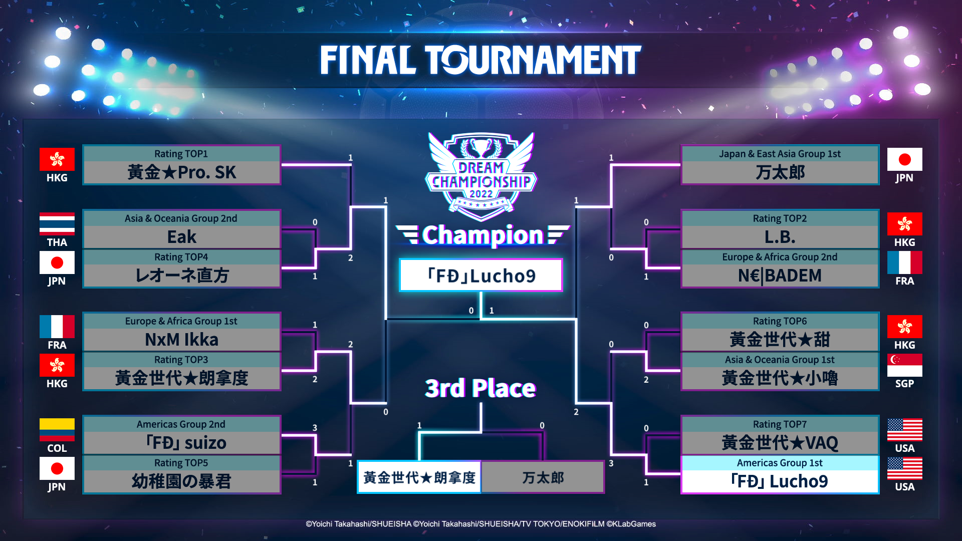 決勝では、後半43分、「FĐ」Lucho9選手の火野 竜馬が放ったジャンピングドラゴンヘッドをレオーネ直方選手のヘルナンデスが止めきれず、「FĐ」Lucho9選手が1点取得しそのまま試合は終了。レーティング TOP4のレオーネ直方選手を、アメリカブロック 1位通過の「FĐ」Lucho9選手が下すという、レーティング上位者と最終地域予選大会のブロック覇者による非常にハイレベルな試合で大会の幕が下りました。